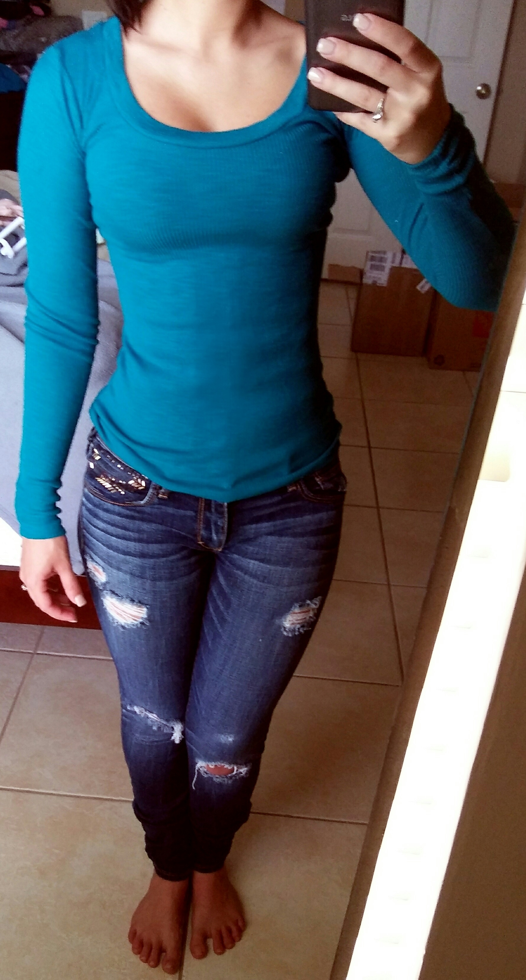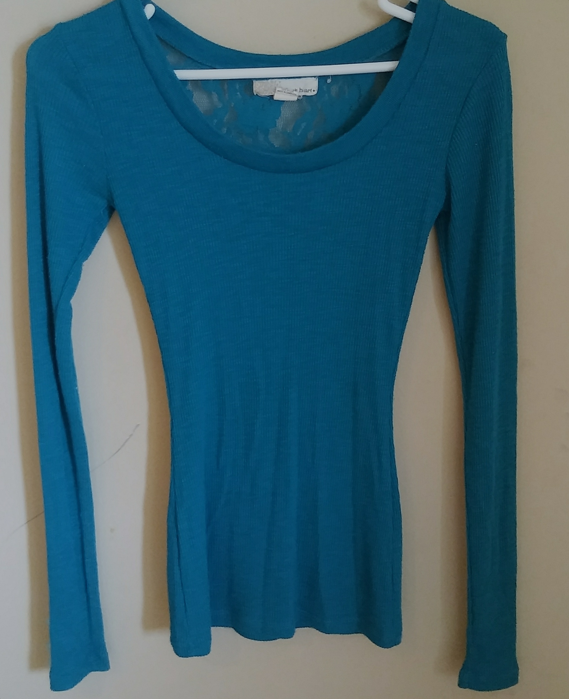 Here is a teal long sleeve shirt by Derek Heart. Great for back to school! Tunic type material. Lace back. See pics. No rips, stains, or tears. Feel free to contact me with any questions. I always do my best to get back to everyone as quick as possible.