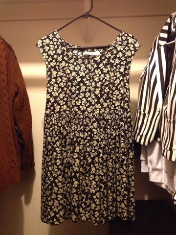 Forever 21 floral skater dress, circle skirt, not too short, has a cute cutout in the back, short sleeved, really flattering... looks great with heels or trainers, fairly stretchy material, really beautiful dress