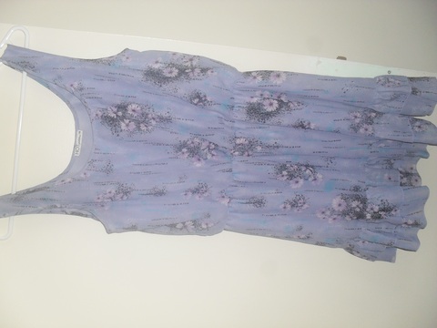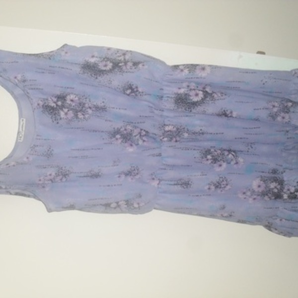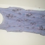 This night gown/dress is from India. It is a bright lovely blue and has purple flowers all over it. It's really fun! This can be used as a long night gown for a fun night or a casual night. It's really comfortable and loose. The material is a mix of cotton and other fabrics. It can be a little stiff, but with some washing it will become softer. It has a sweet rounded neckline and a little bow tie on the chest. The sleeves have purple dots. This items fits small - Large-medium