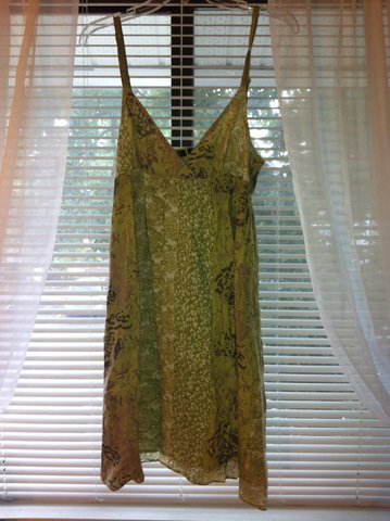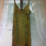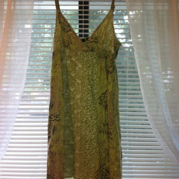 dull lime green color. has flower and leaf designs on it in white and shades of brown and green. adjustable straps. above knee length