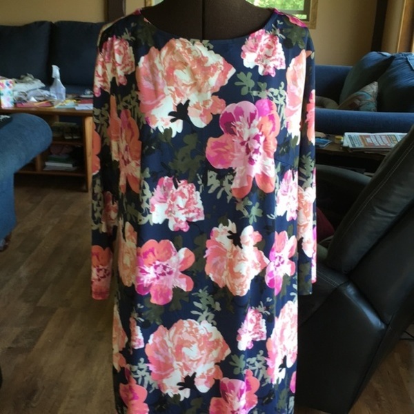 Dark blue shift dress with pink roses. Has 3/4 sleeves and a dark blue band across the bottom. Reaches to around the knee area, may differ depending on height. Still new with tags.