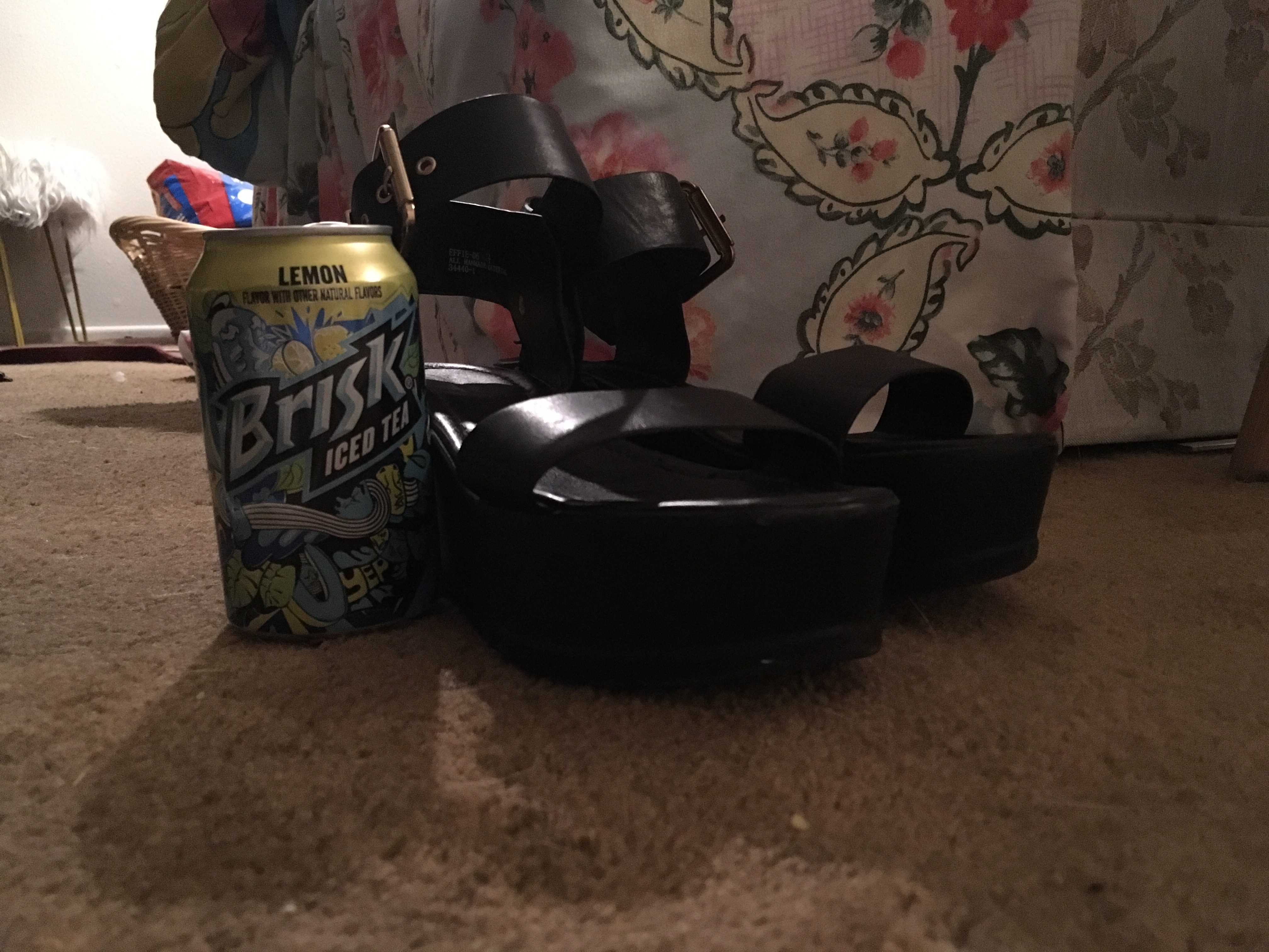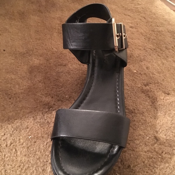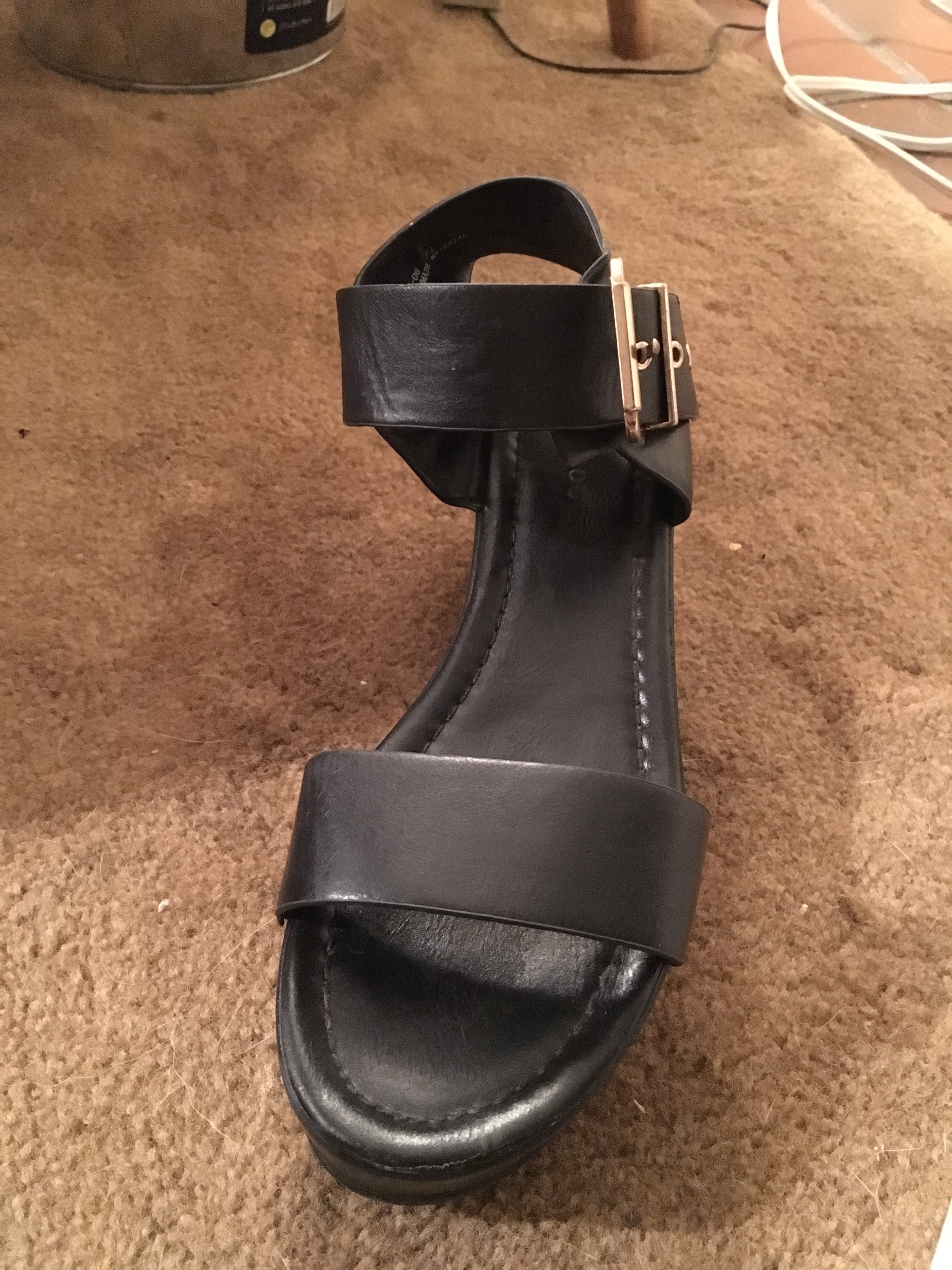 Black platform heels. Gold buckle/metal detail. Size says, “7.5” - but that’s a flat out lie - they fit like an 8.5. ~3 inch heel... average soda can included in photos for size comparison. They’re super comfy!