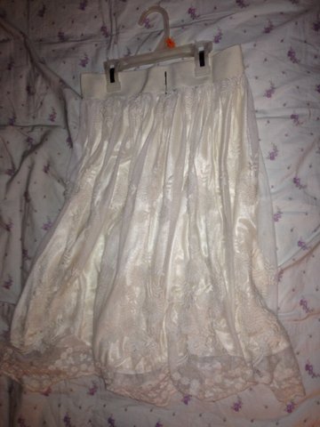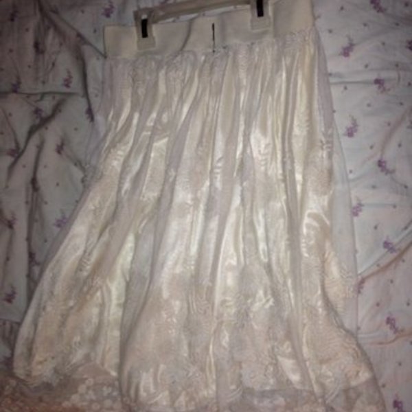 This skirt is gorgeous and in great condition EXCEPT there is a hole right by the waistband. It can be easily fixed with a sewing machine or even a needle and thread. I just never wore it so I can't be bothered.The hole is write where that big metal safety pin is in the picture. lol. It's a creamy color. with a silky layer under the lace. can be worn as a long skirt, or high in the waist.