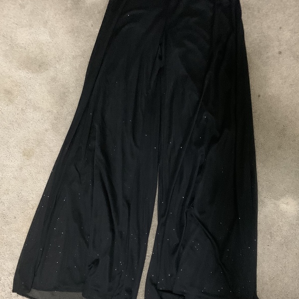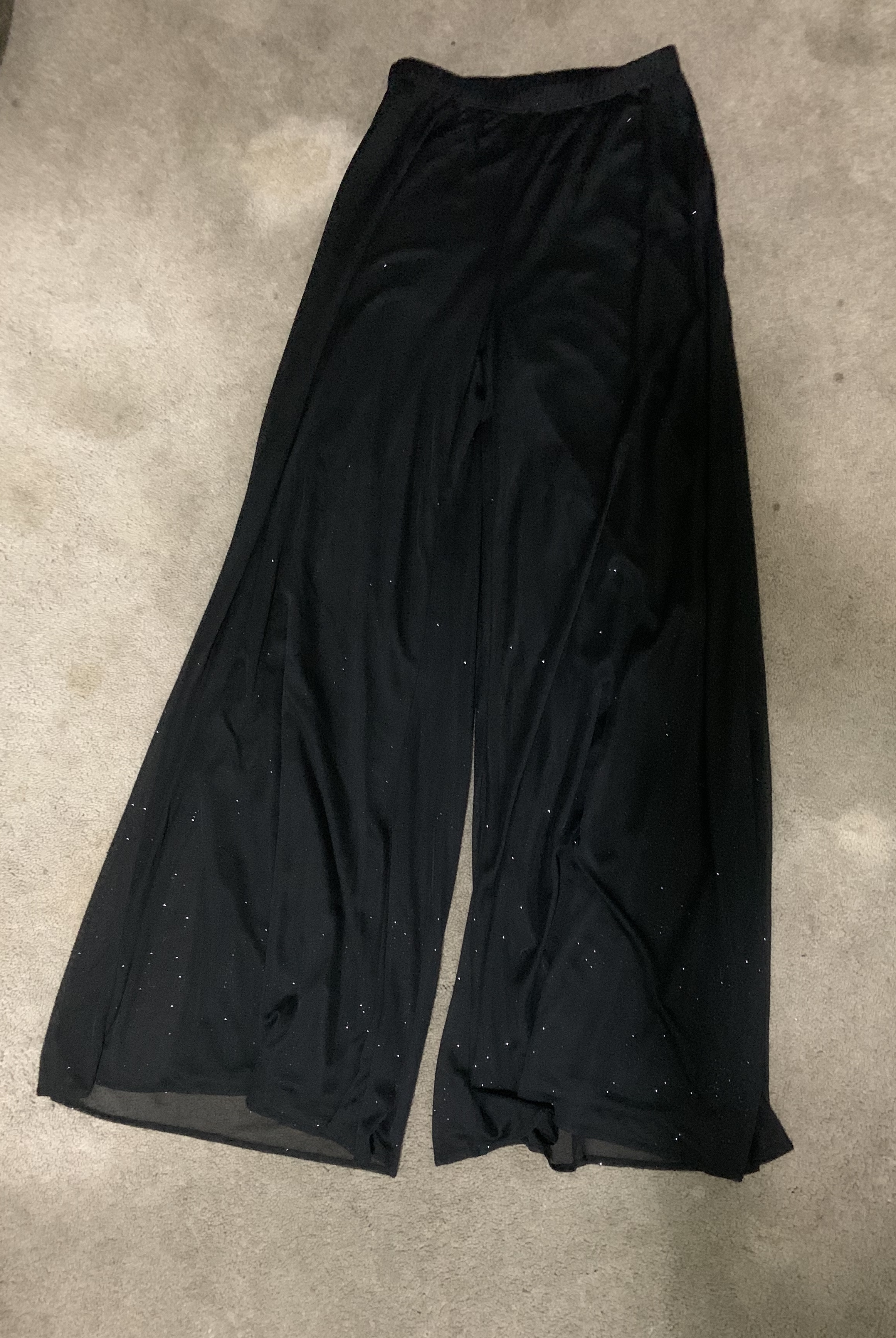 Not shown in the picture but pants are sparkly. The waistband is stretch and the pants are very flowy and flare at the ends. These pants are also high waisted and are great to make a statement or for a fancy event.