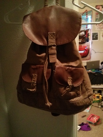 two outside pockets w/ buckles; magnetic snap buttons and draw string; pockets inside; worn leather; 2 shades of brown; great condition; barely used; slouchy and cute; very spacious; from Pacsun