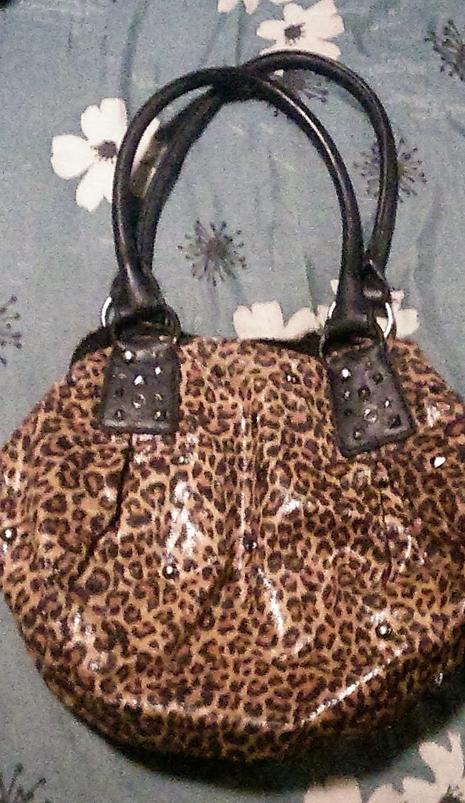 Black patent hobo-style purse. Lightweight synthetic patent material. Silvertone hardware. Fits comfortably over the shoulder and is reasonably roomy. Purchased new from eBay, only used a few times. No apparent wear or flaws.