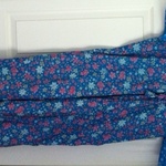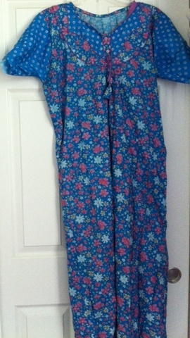 This night gown/dress is from India. It is a bright lovely blue and has purple flowers all over it. It's really fun! This can be used as a long night gown for a fun night or a casual night. It's really comfortable and loose. The material is a mix of cotton and other fabrics. It can be a little stiff, but with some washing it will become softer. It has a sweet rounded neckline and a little bow tie on the chest. The sleeves have purple dots. This items fits small - Large-medium