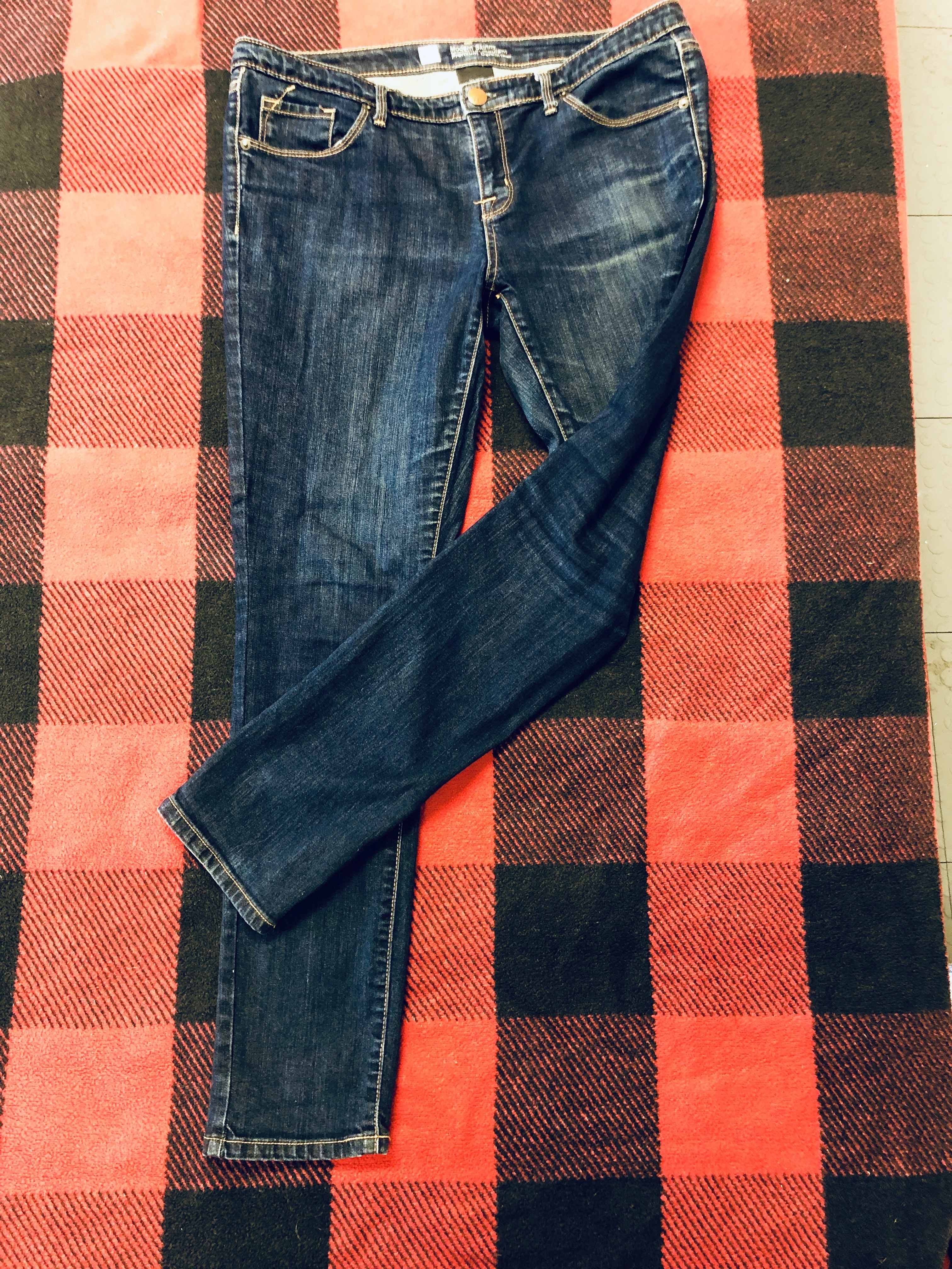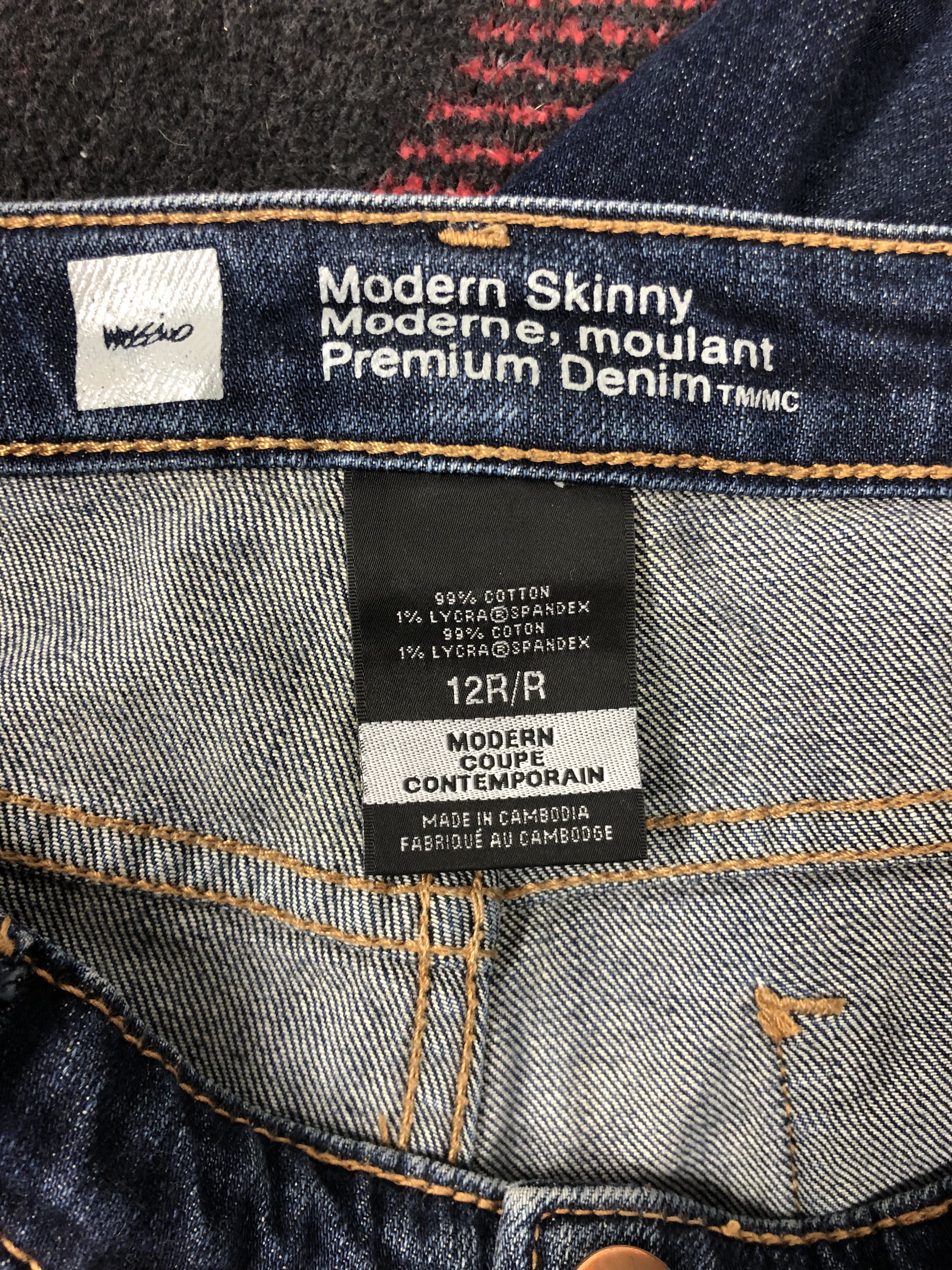 Modern Skinny Jeans size 12R/R worn by my mom no more than twice. The color is a little more blue than the photos show (the white is showing up more for some reason). Stretch jeans.
