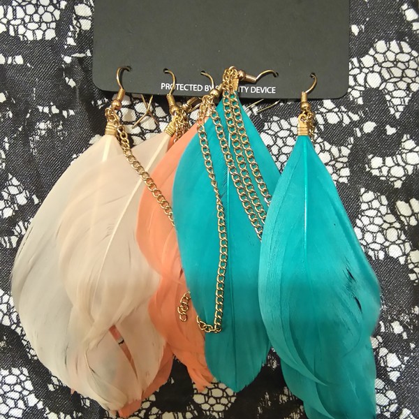3 different colored feather dangle earrings. The orange pair have been worn but the white and teal ones have never been worn.