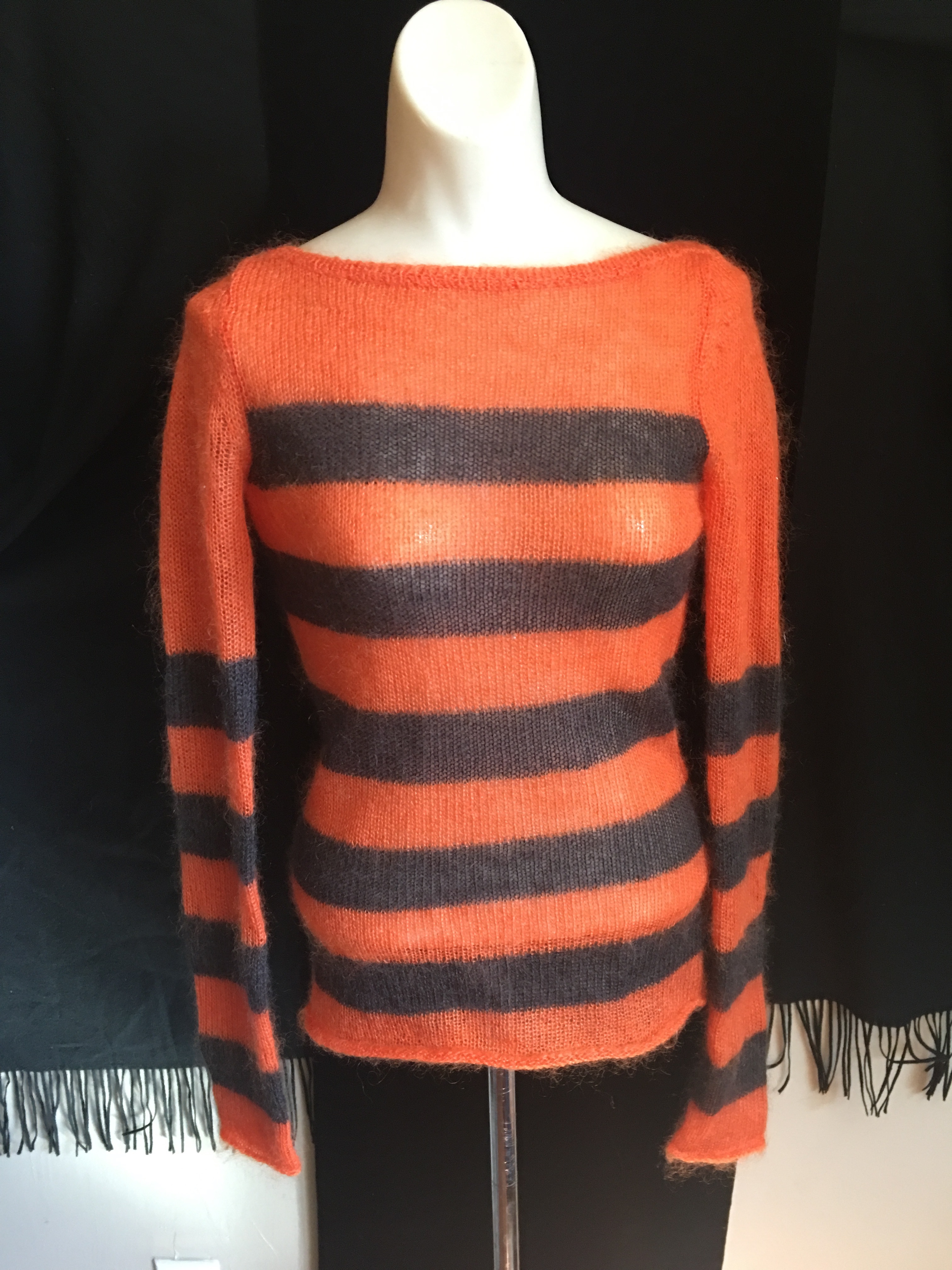 Great orange and black stripe sweater from Juicy feature a boat neck and a mohair like feel.