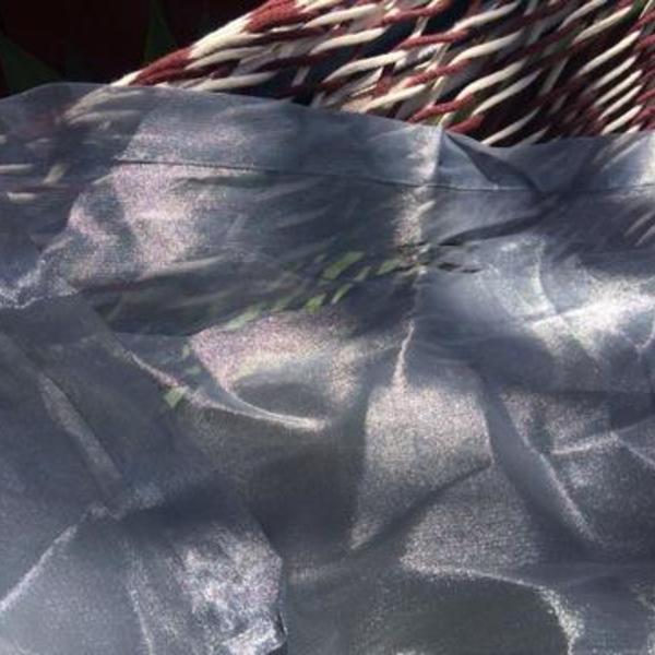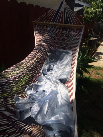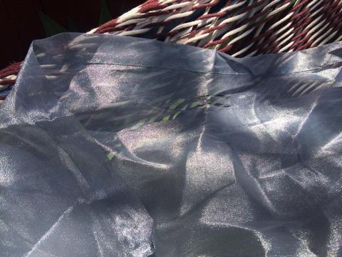 Two long metallic curtains. Sheer silver material. Each measures 3 feet by 7 feet long. There is a small tear at the bottom of one but it wouldn't really be noticeable since it is near the floor. Made in India. I also have some curtain holders in another listing.<br>Hammock not included :)