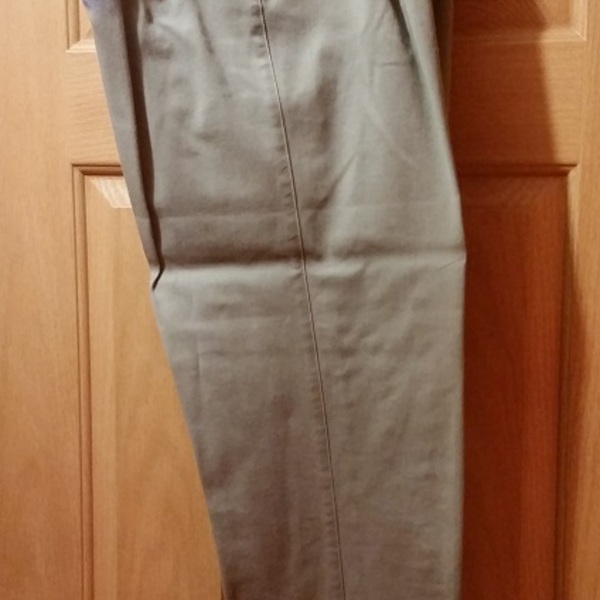 Re-rehash from a while back. I thought I would wear these, but my work dress code switched from khaki to black, and I never put these on. Tan colored button fly boot-cut pants. There's a few loose threads to be clipped so I marked them as good - there is no wear on the cuffs or pockets. Snap button fly.