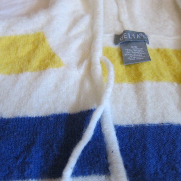 I looooove this sweater. It's so warm and comfy. Unfortunately too small for me now. Will be a bit picky. :) It's woven, in great condition. You can see it is not *brand* new though.