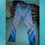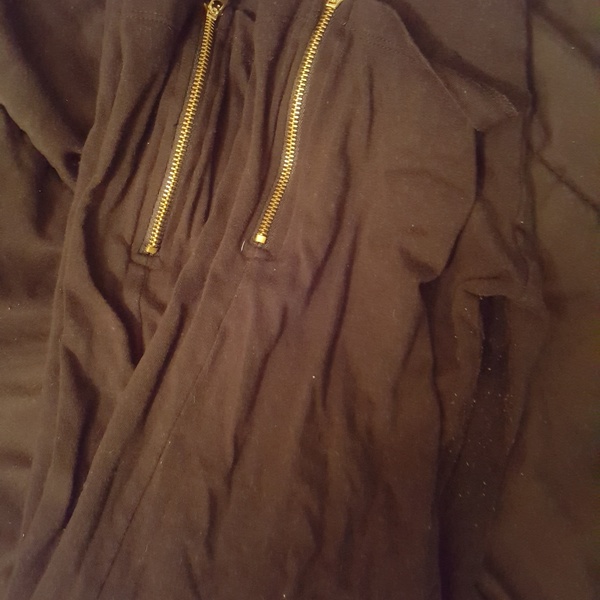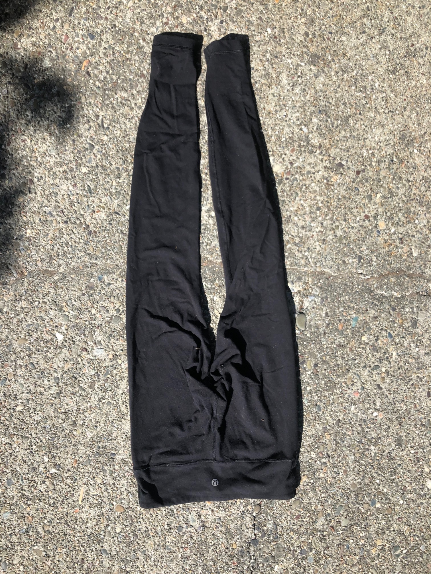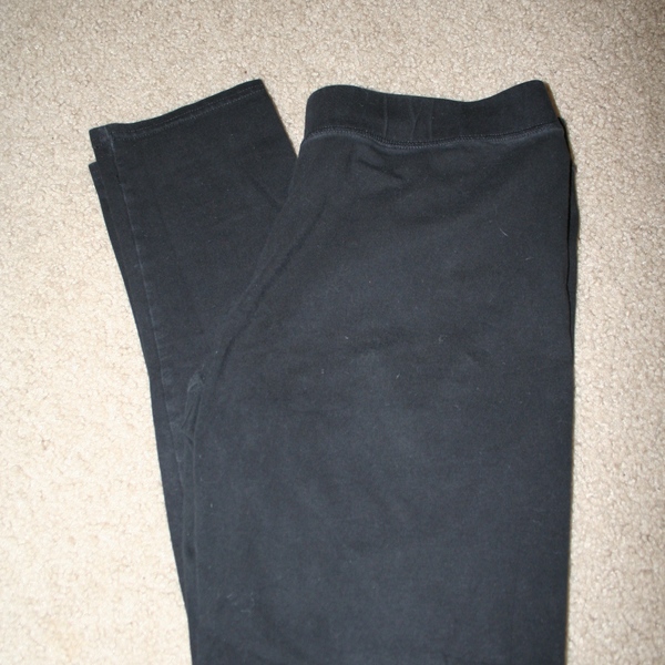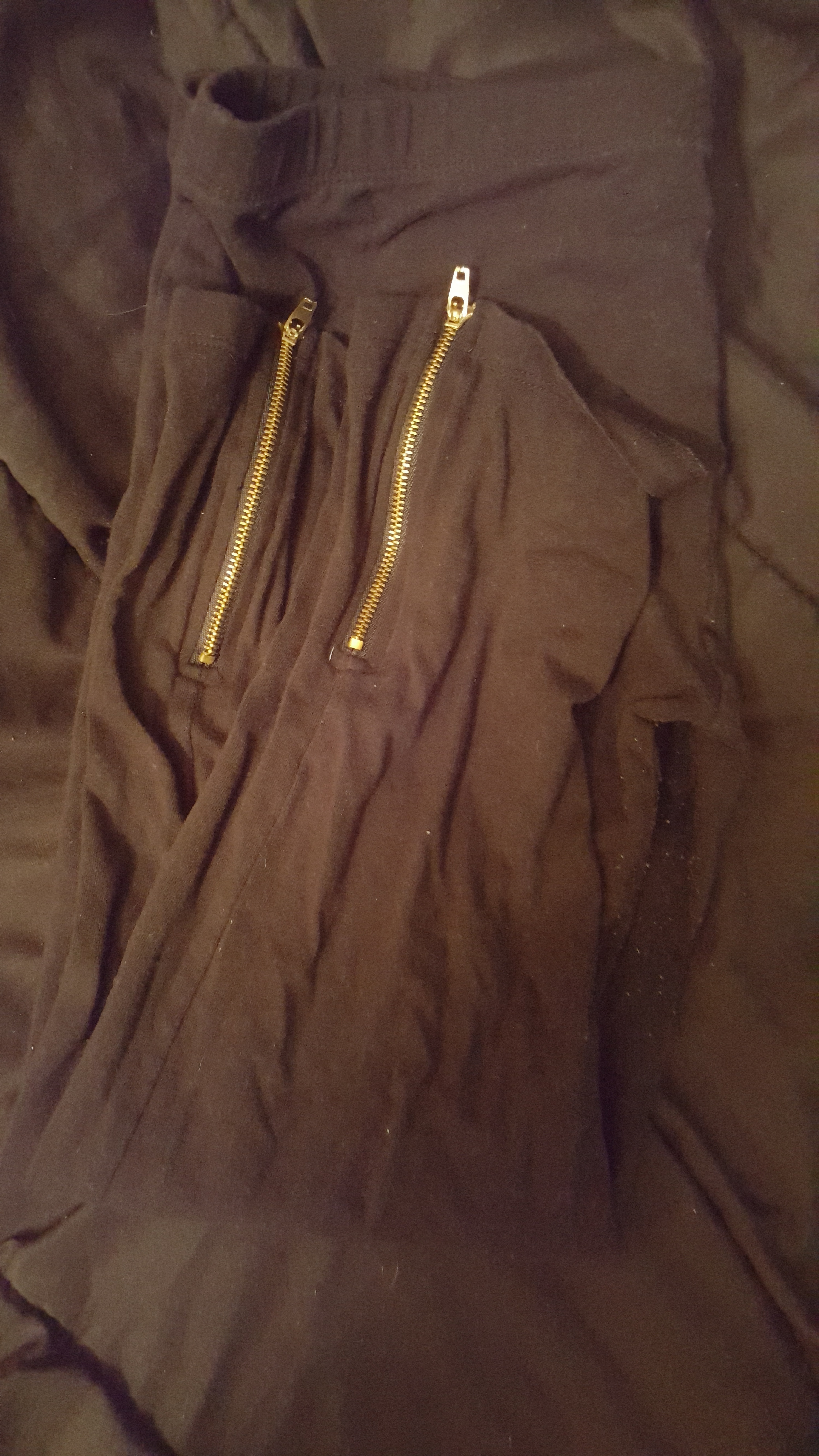 Black Leggings with zippers on each side. Comes right below knee caps and is a lighter fabric. Has use but still in wonderful condition. Comes from a smoke free home and will be washed before being shipped out (: