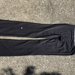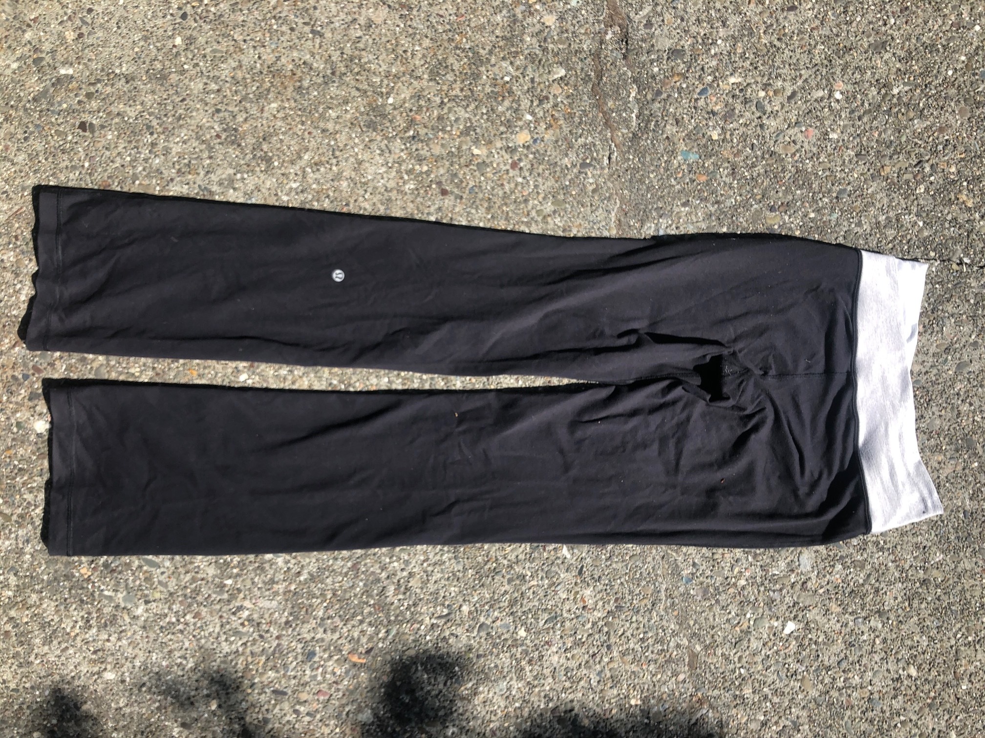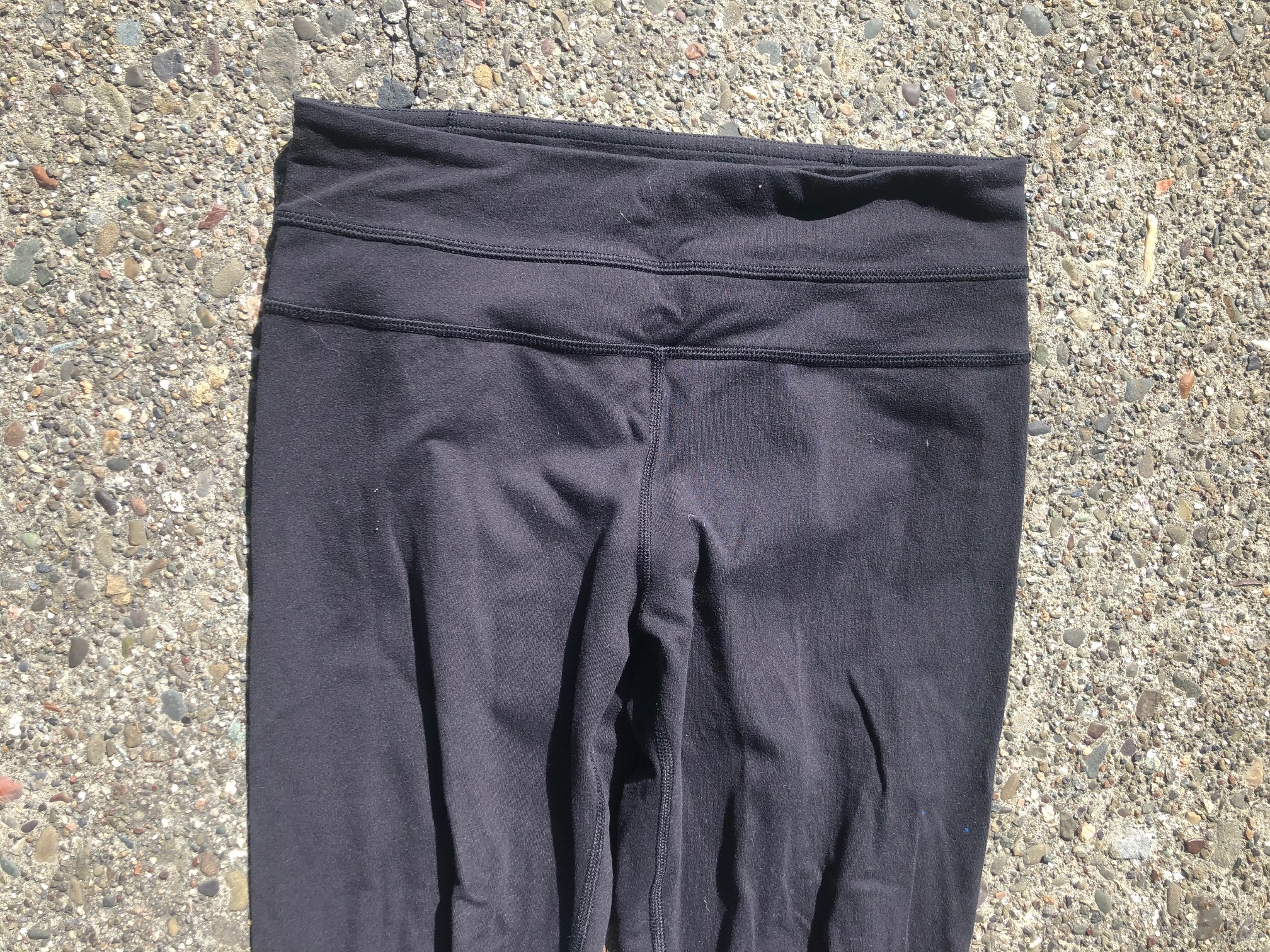 These pants are super comfy! They are mid-rise, with a criss-cross waist band that falls right below the belly button and lands a bit higher on the hips. The criss-cross keeps them from digging into your stomach. They are Lulu's "Regular" length, with flared bell-bottoms. They have good compression, and the fabric is thick enough for them to be "squat proof". They are an older style, but minimally worn and in great condition!