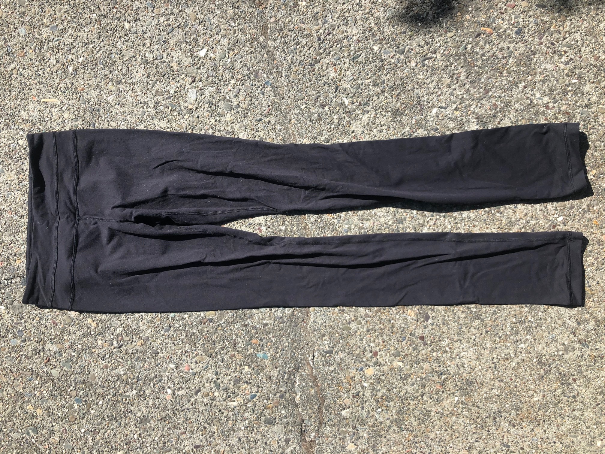 These leggings rock. They are a lower-rise than many newer styles, and sit around the hips. They are skinny through the legs and have great compression. They have a pocket in the waistband that is large enough for smaller phones, gym cards, or keys. They are lightly worn, in great condition, with one small, frayed seem at the back waistband.