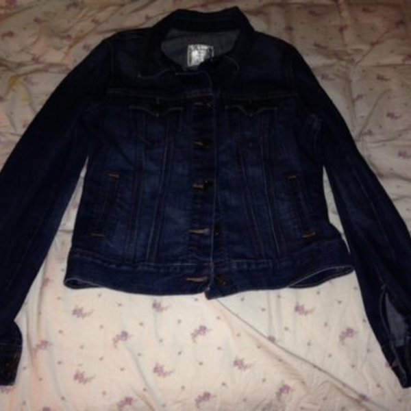 size small white zip up jacket with faux fur trim instead of a hoodie from old navy. peace sign made of rhinestones on the back. its only a little wrinkled after being in my closet for so long :P its never been worn out! :)