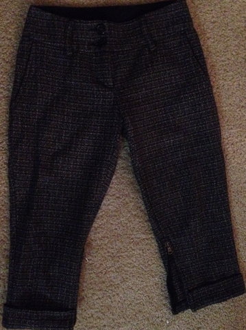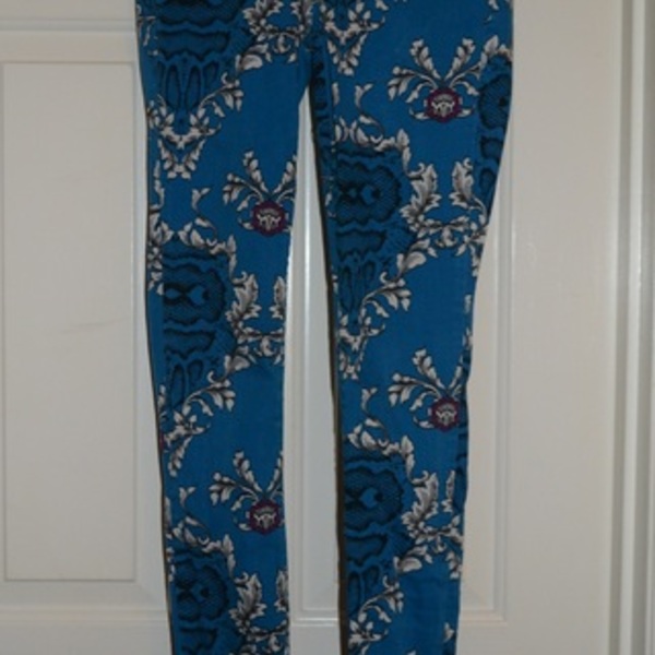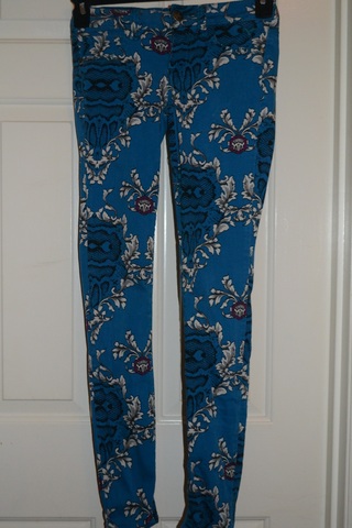 -bright blue pants with white floral print -slightly stretchy I've had these pants for at least 4 years, but I have not worn them in a year or more
