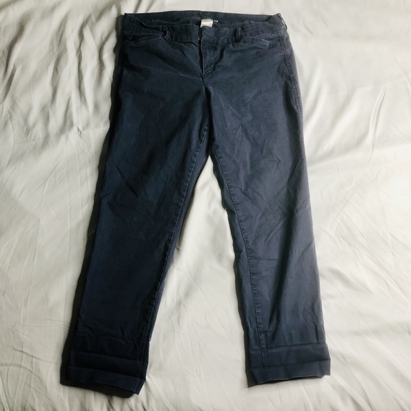 Blue old navy pixie chinos with a regular inseam. I'm short so I had to roll these up a few times.