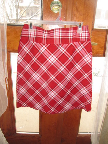 Cute plaid skort from Dress barn. Much loved but I have outgrown this. It has wide belt loops , two front side pockets and a key pocket. Two 'fake' button flap pockets on back side. 3" zipper in front.