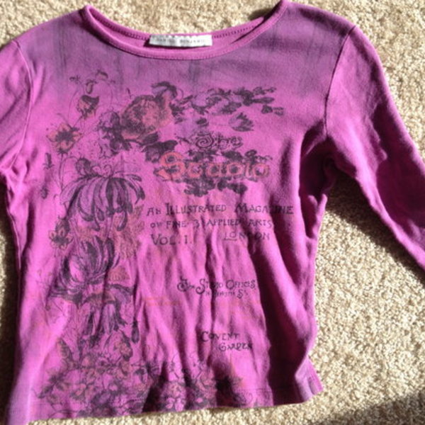 Purple sweater with a pink, red and white design on the front. The back is slightly longer than the front. A bit older, but still in very good shape.