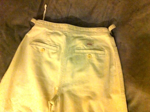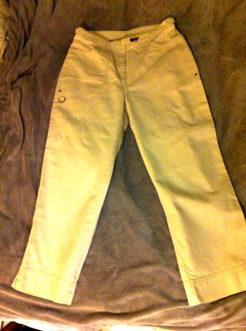 100% cotton in a classy, micro-rib twill. Side vents at the below-the-knee hem. Side pockets and button-through back pockets. I love the unique front closure, which is a streamlined metal clamp: I don't know what to call it, because I've never seen a closure like it! Light tan Ralph Lauren short pants or long shorts. Whether you want to call them "capris", "clamdiggers", or "crop pants", these are that perfect in-between when shorts aren't appropriate (or are too cool) but pants aren't right, either. The fabric has a subtle pinwale ridging to it, which gives them a soft, but not worn, texture. Side pockets and back pockets, side vents on legs and a tab front closed with a small, decorative metal catch. Adjustable D- rings on sides (small). 100% cotton, machine wash and dry. 2 Petite, it's also good for a curvy size 0 gal. I wear a 0 or XS, but these are cut for someone who is more curvy than me.