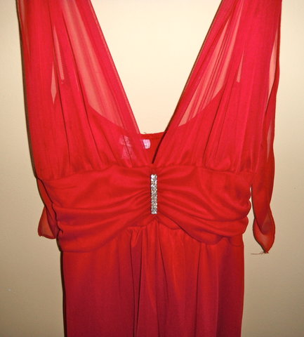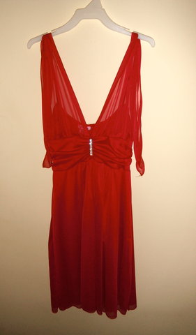 This dress is from Boa, and it has been worn once. It is a very nice red colour and it has halter straps that are tied above the neck. Jewelled strip between the bust. Really quite flattering on most people.
