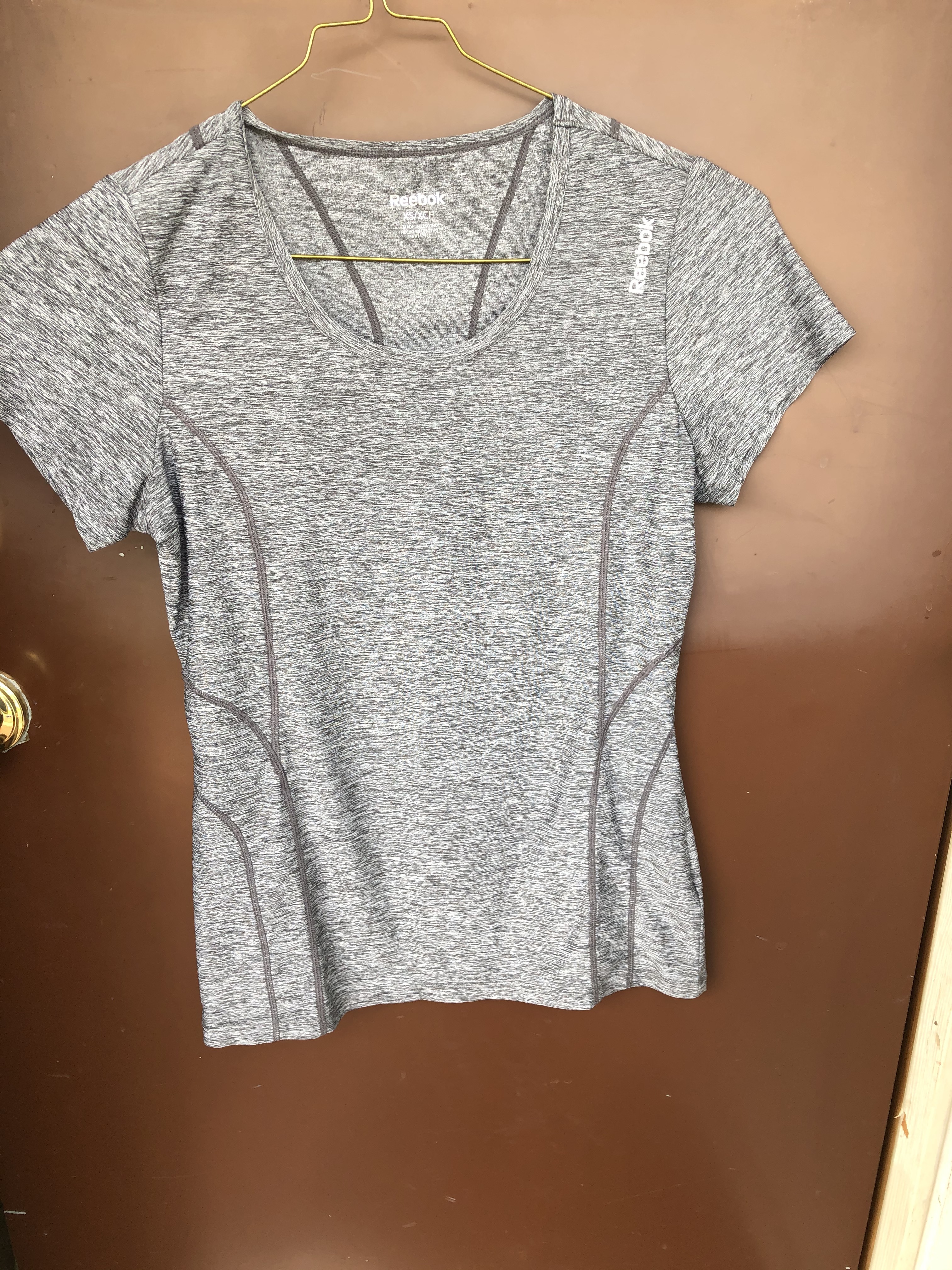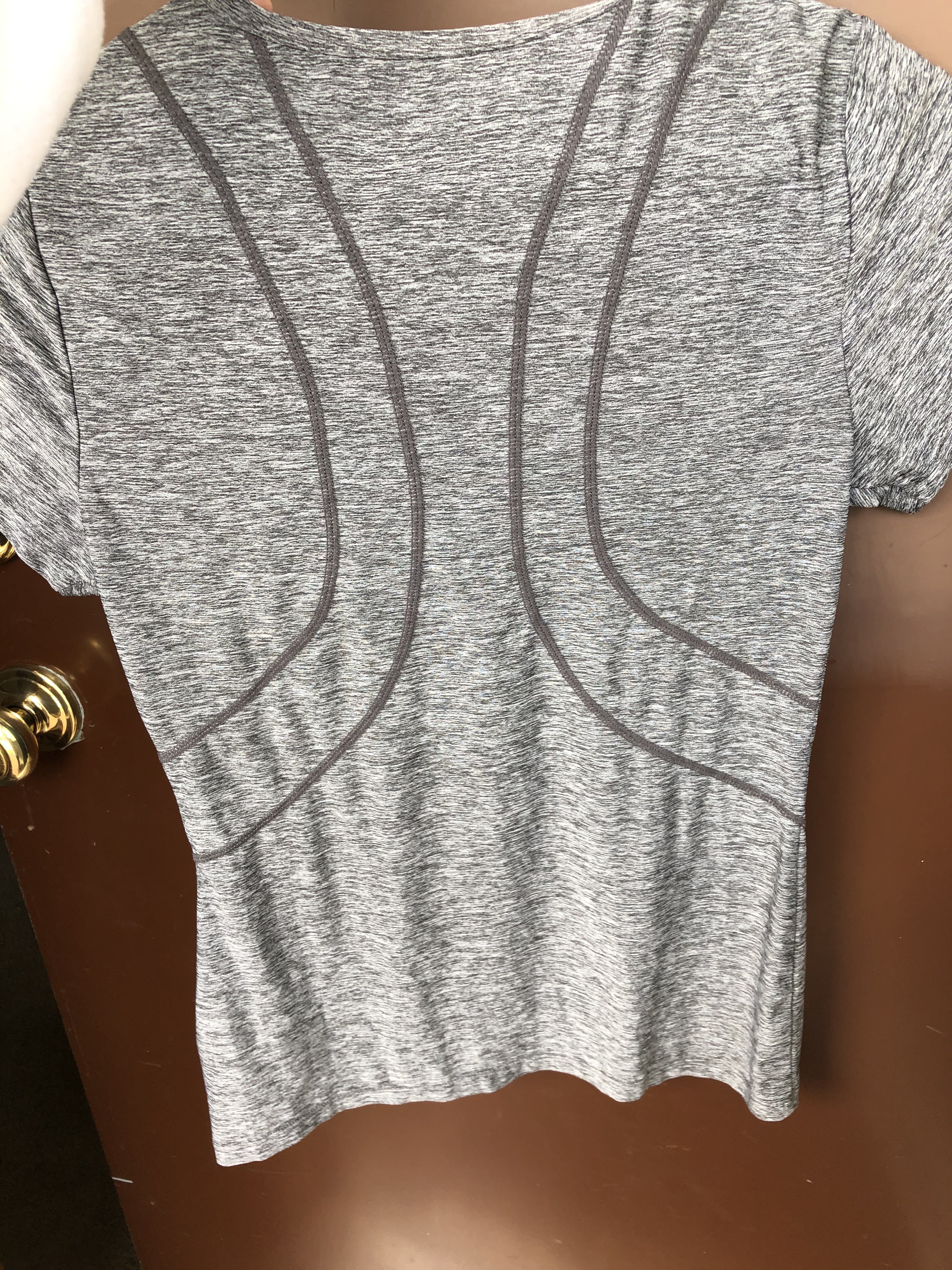 lightweight exercise sweat jacket with a discrete gray pattern. Has long sleeves, pockets, and zips up . It does have some wash wear, as seen in the pics. Measurements Pit to pit: 20.5 in Length: 24 in