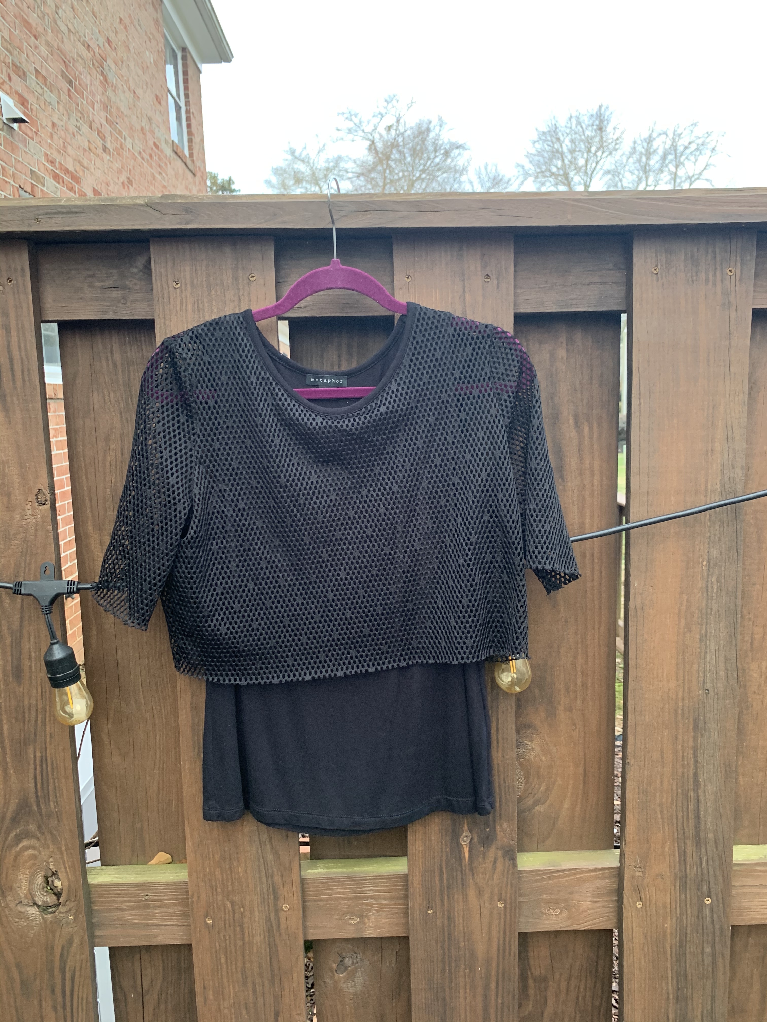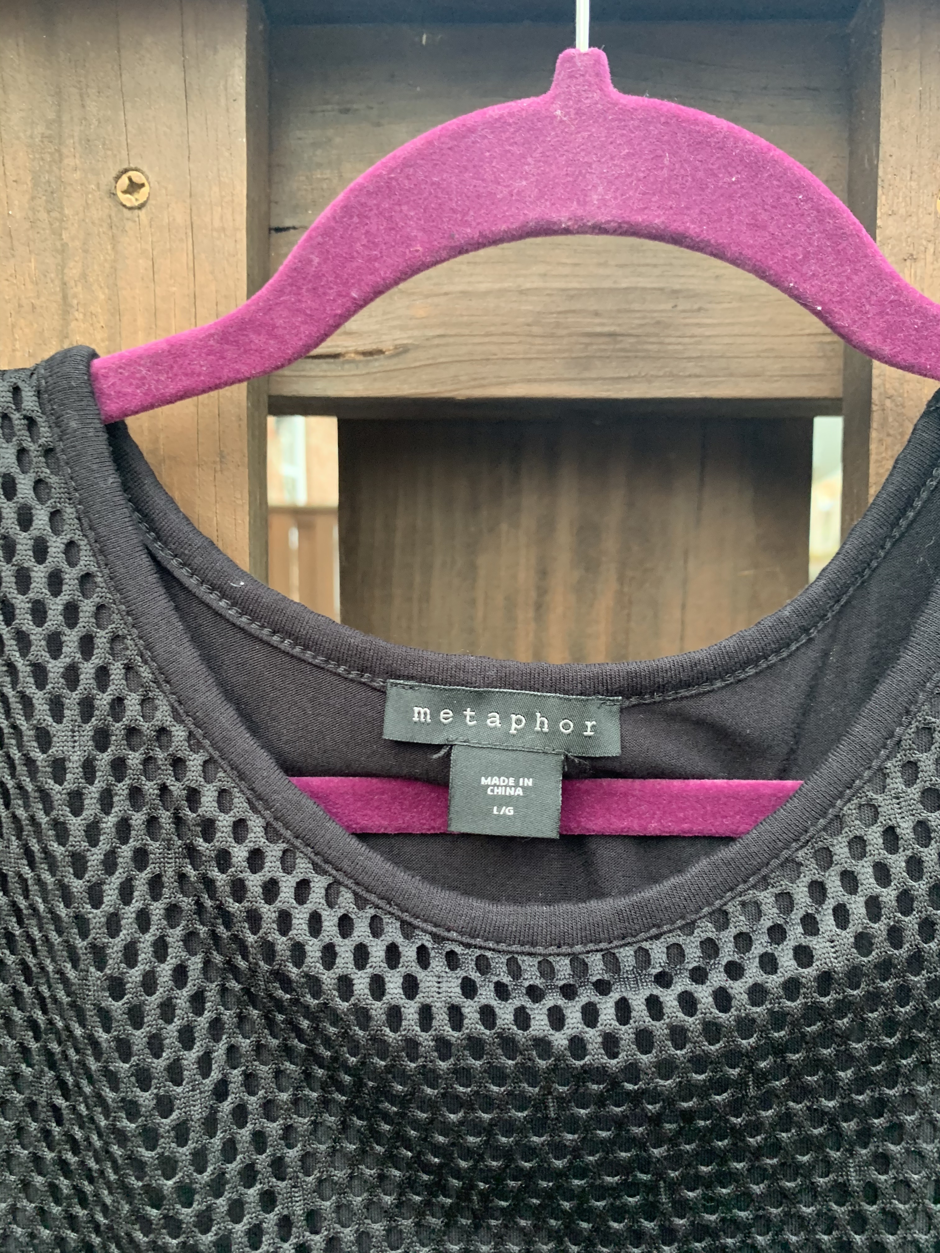 Size Large, but def runs small. Worn a few times, but I loved every time I wore it! Gives me retro 80s vibes! Great paired with large earrings and bright makeup.