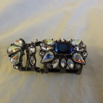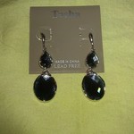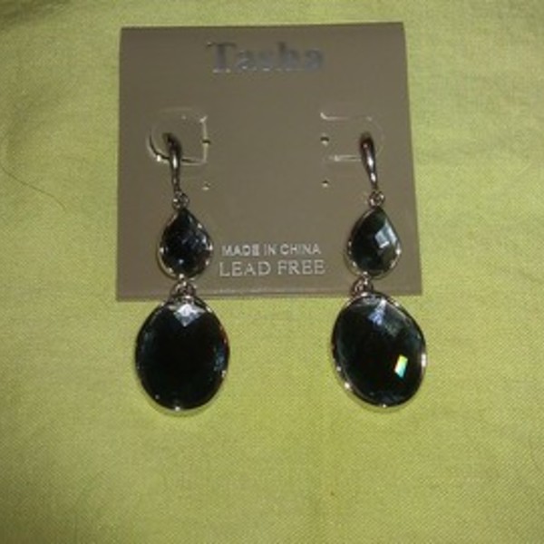 Very nice drop earrings. The metal is chrome with dark grey jewels. Very solid and a good size. Tried on, but never worn.