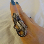 Orange stone ring with a silver band, stone is about a inch in length and 3/4 inch in width. Has a bit of blue and red in the stone as well.