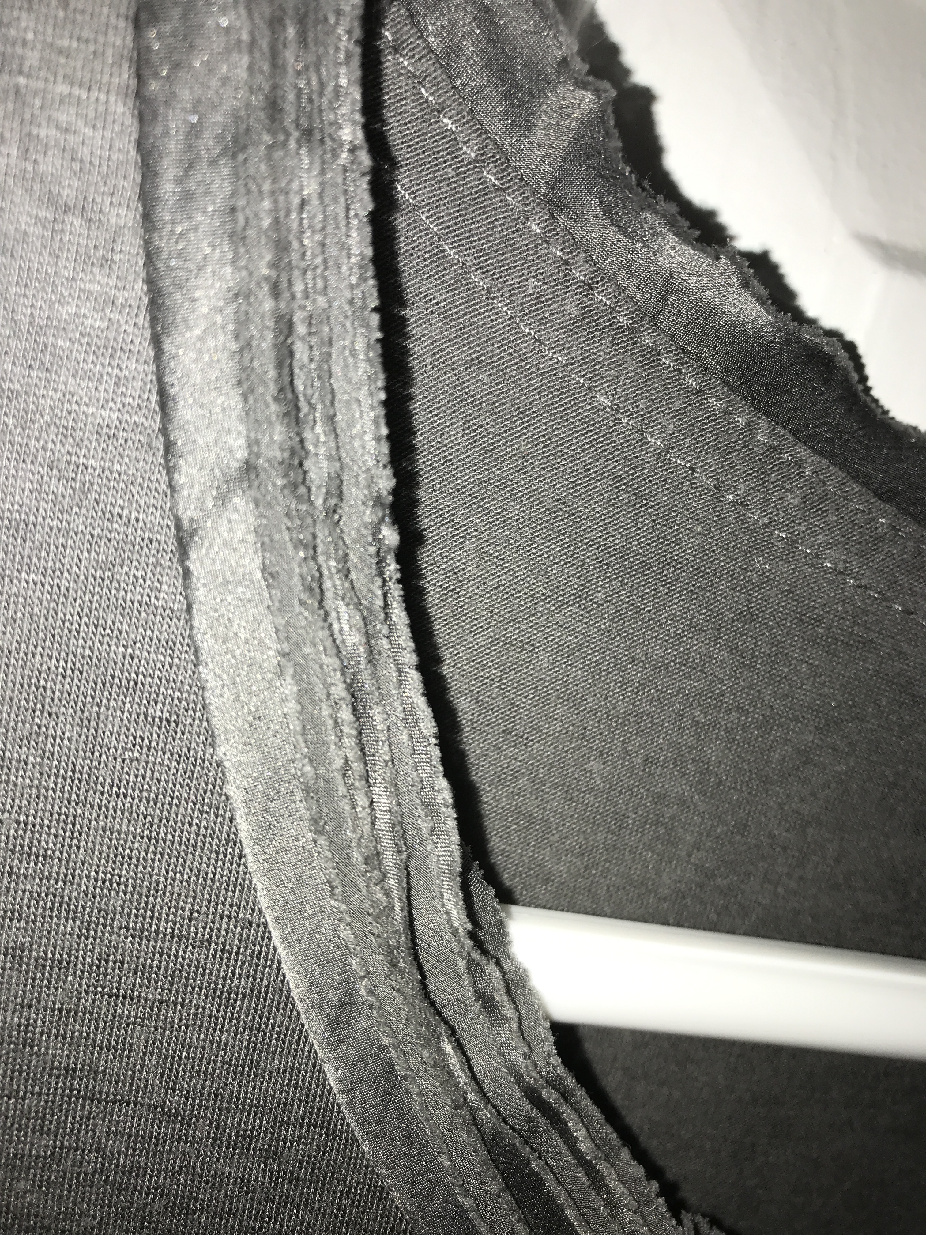 A gray woman’s t-shirt from Banana Republic in excellent condition. The frills on the neckline really dress this shirt up so it can be either casual or more of a neat casual.