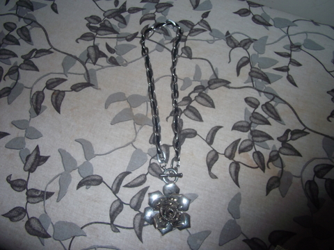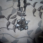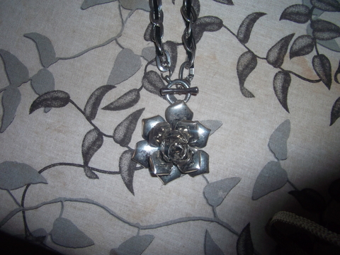 Bought from specialist craft stall in uk. mostly silver colour, black ribbon through chain. never worn.Rose not really heavy.