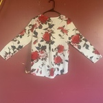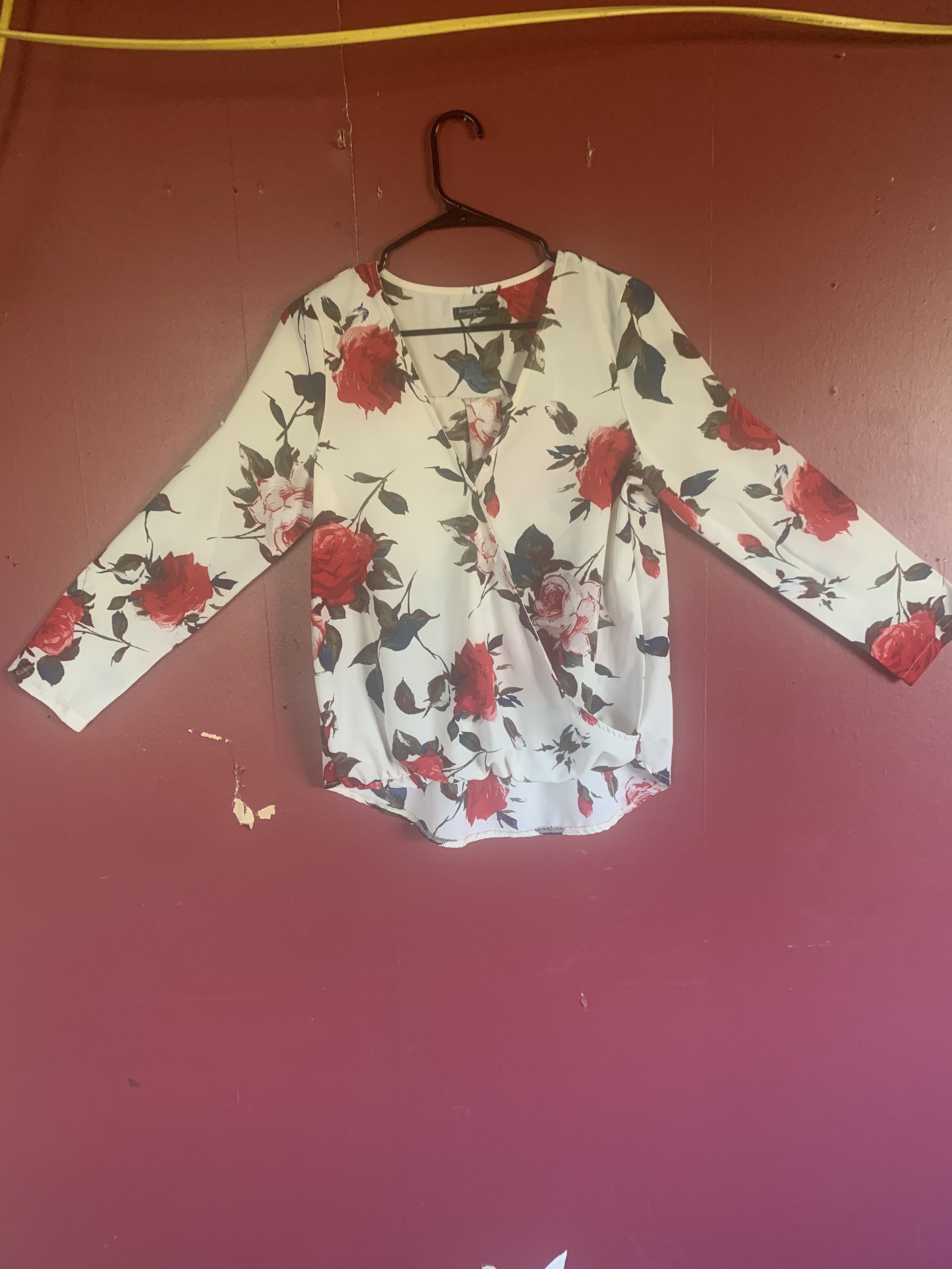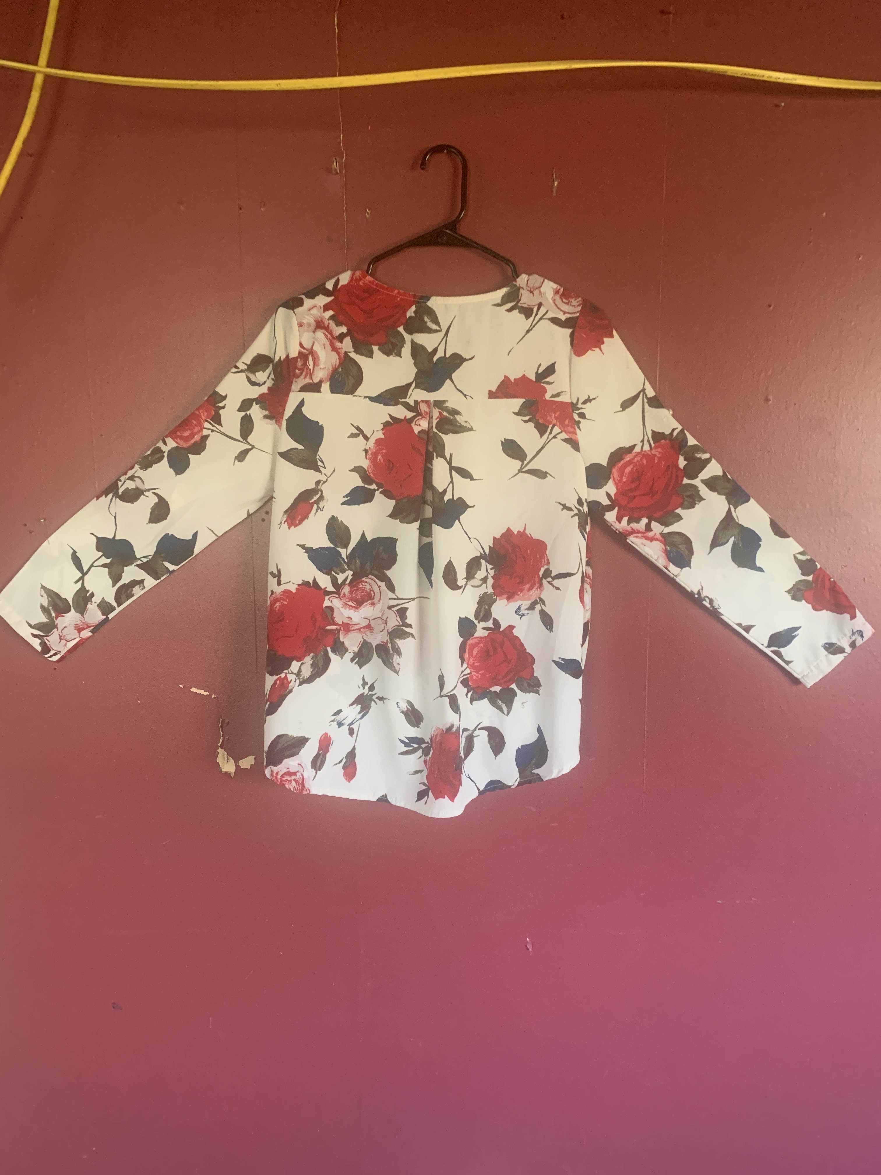 Cute dressy blouse with roses super cute style with cross front and v neck dressy and professional.