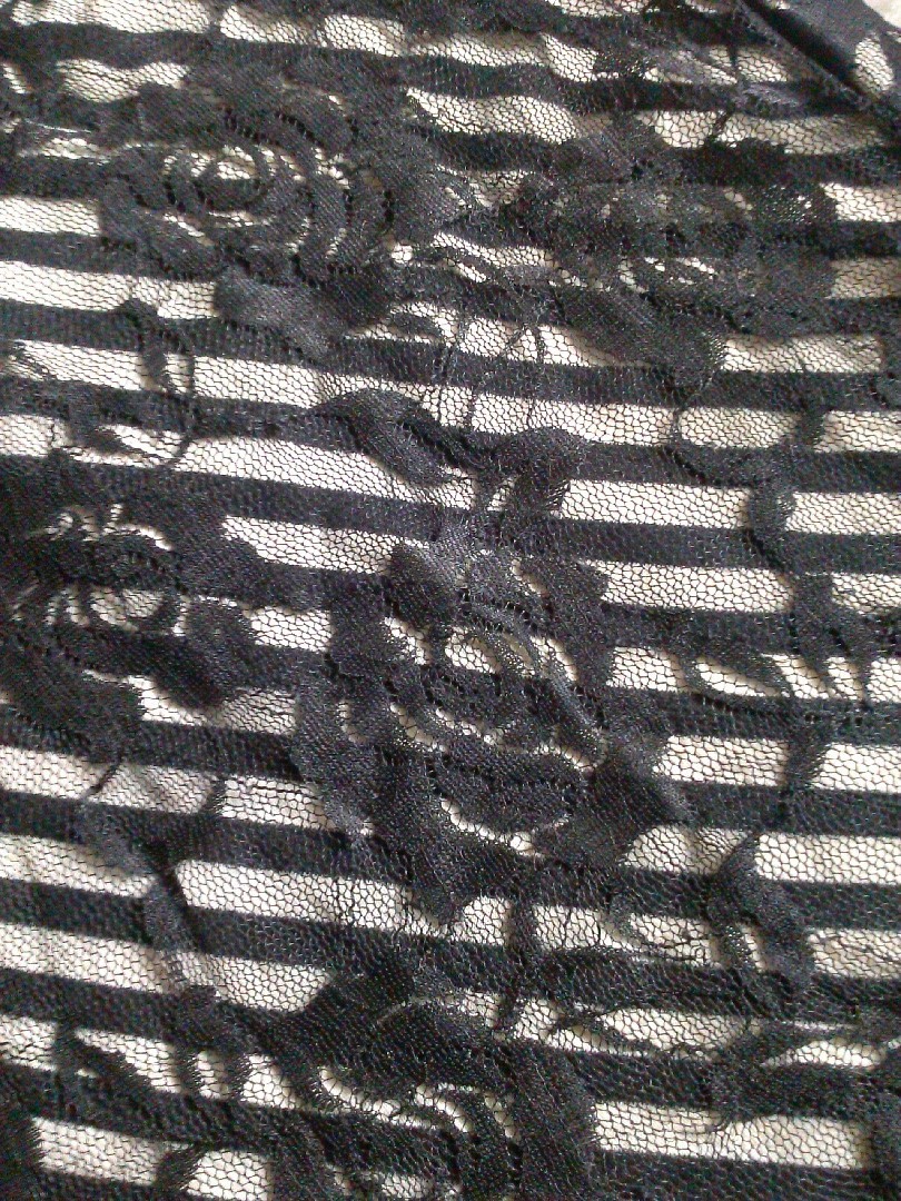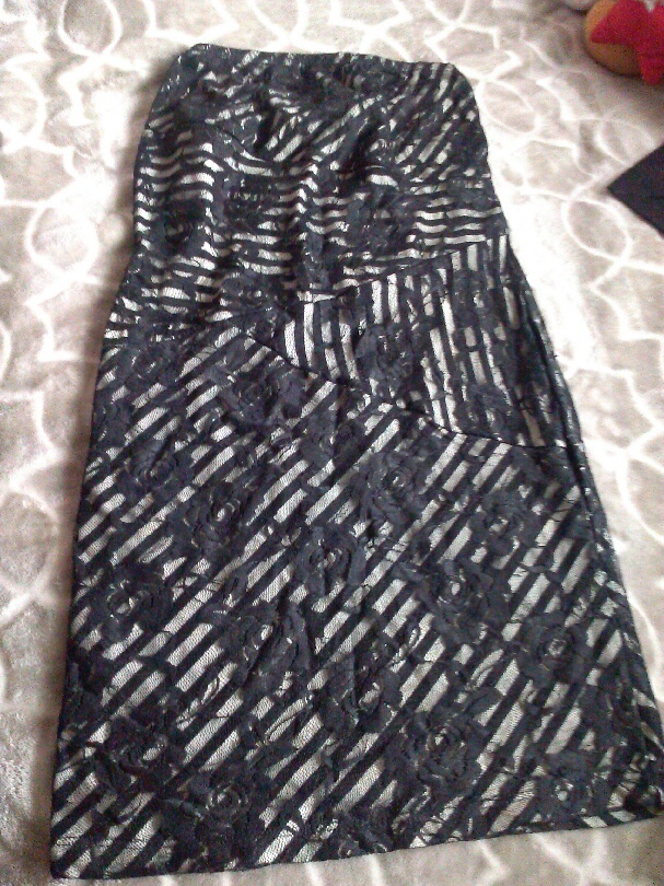 The first layer is a light beige stripped design. The second layer is a lace with a rose pattern. Never used still has tags. From Rue21. The dress has no lining so it may be a little see through.