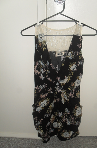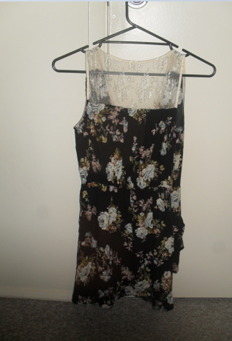 Junk. floral navy, white, pink, green and creme dress with ruffle detailing at the top front and creme lace detailing at the back. Purchased for $15.