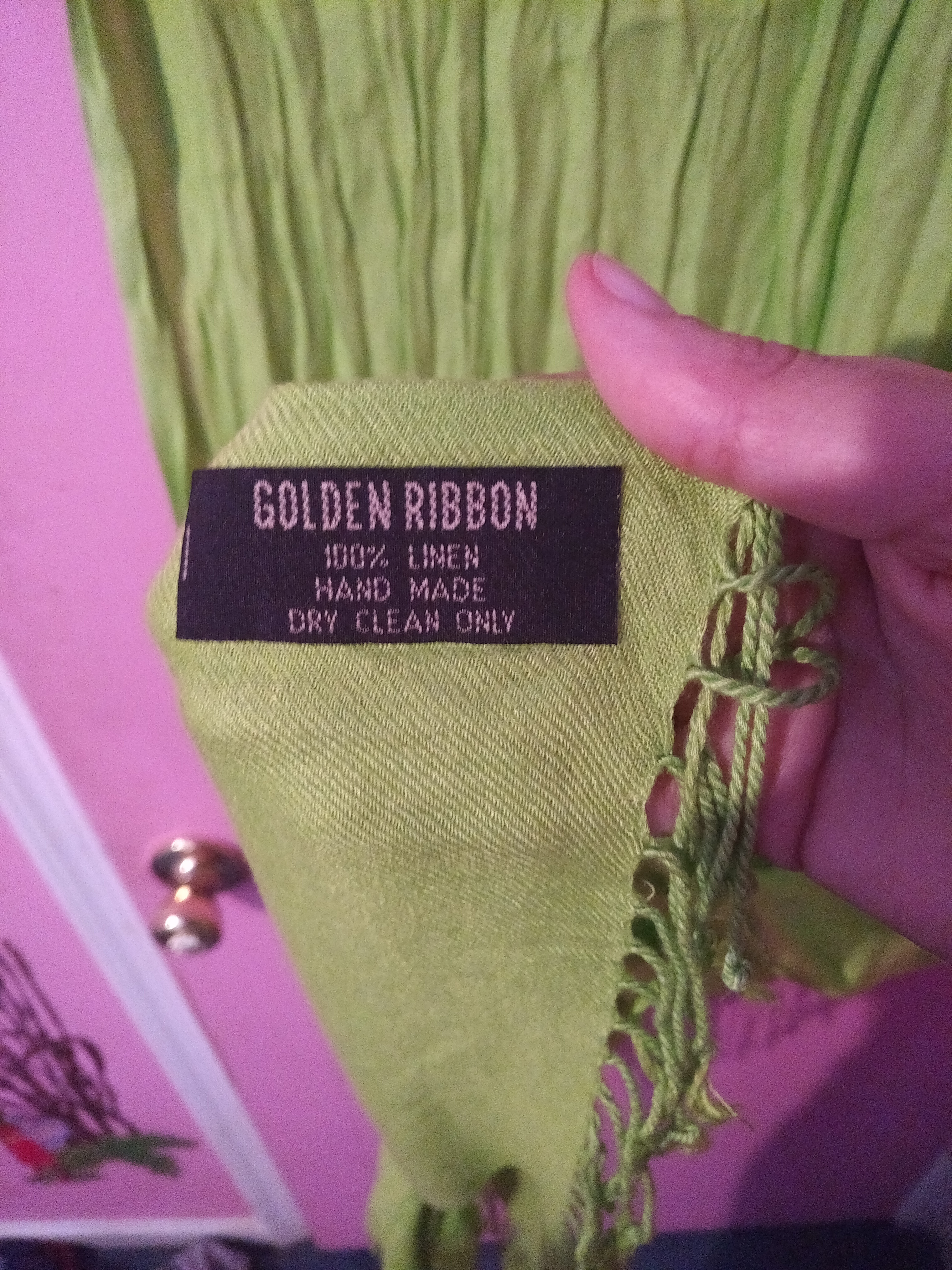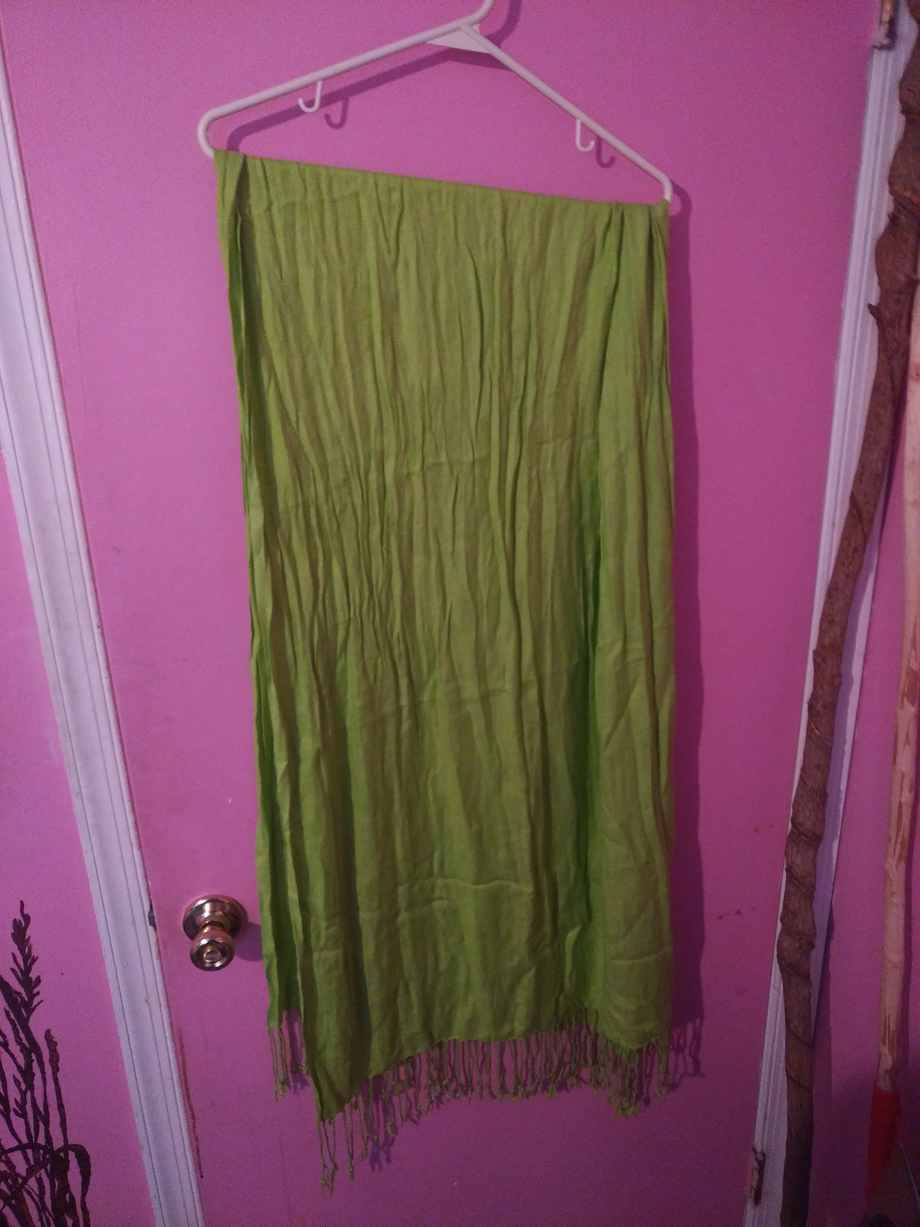 Large lime scarf with tassels, in excellent condition. Roughly 6 feet long, and 2 feet wide. Made of linen, and very comfortable.