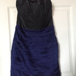 Size 4 dress. Express plested dress. Faux leather bodice. With straps included. Brand new without tags. Minimal pulling on skirt. And minimal peeling at the zipper. Look at the picture for these imperfections. Any questions, ask.