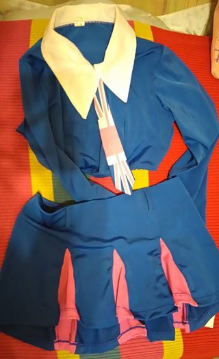 School Girl Costume in a size MEDIUM. Soft silk-like material. Deep blue color with white collar and cuffs and a British flag tie in blue and pink. The TOP is long sleeve and has a circle opening in the chest also very short, shows stomach. The BOTTOMS are tight fitting and very short.