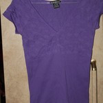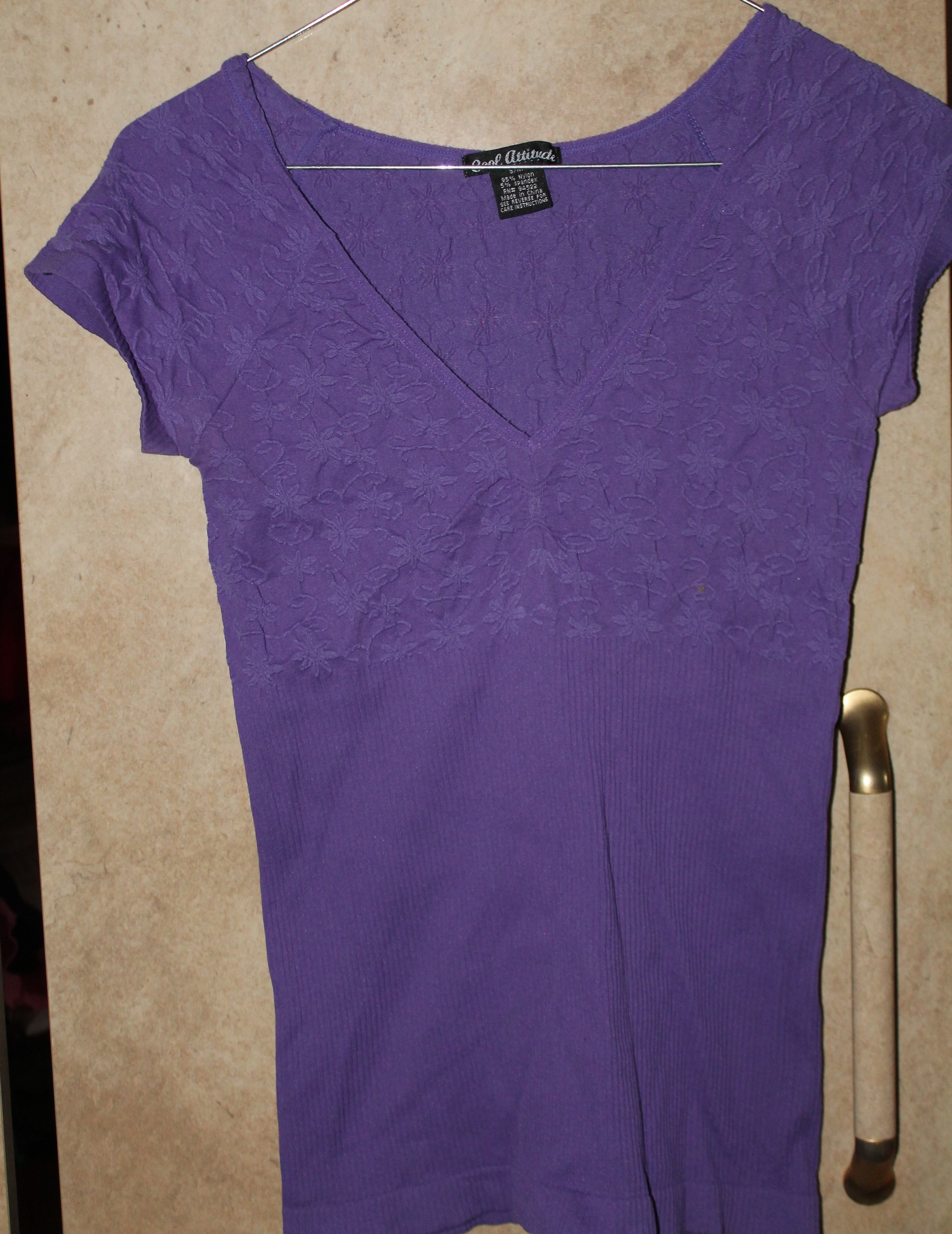 Item: Short Sleeve Shirt Brand: Cool Attitude Material: 95% Nylon and 5% Spandex Size: S/M Design: Purple Shirt Indented Floral Design with Contrast Indented Vertical lines