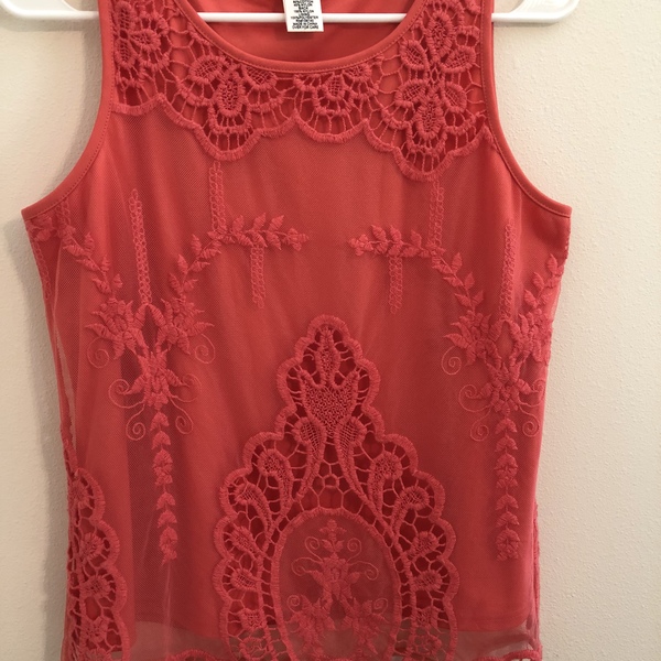 This is a size small, women’s beautifully embroidered salmon pink lace sleeveless top By Ultra Pink. It has no rips, stains or tears. The color in the photo appears darker.