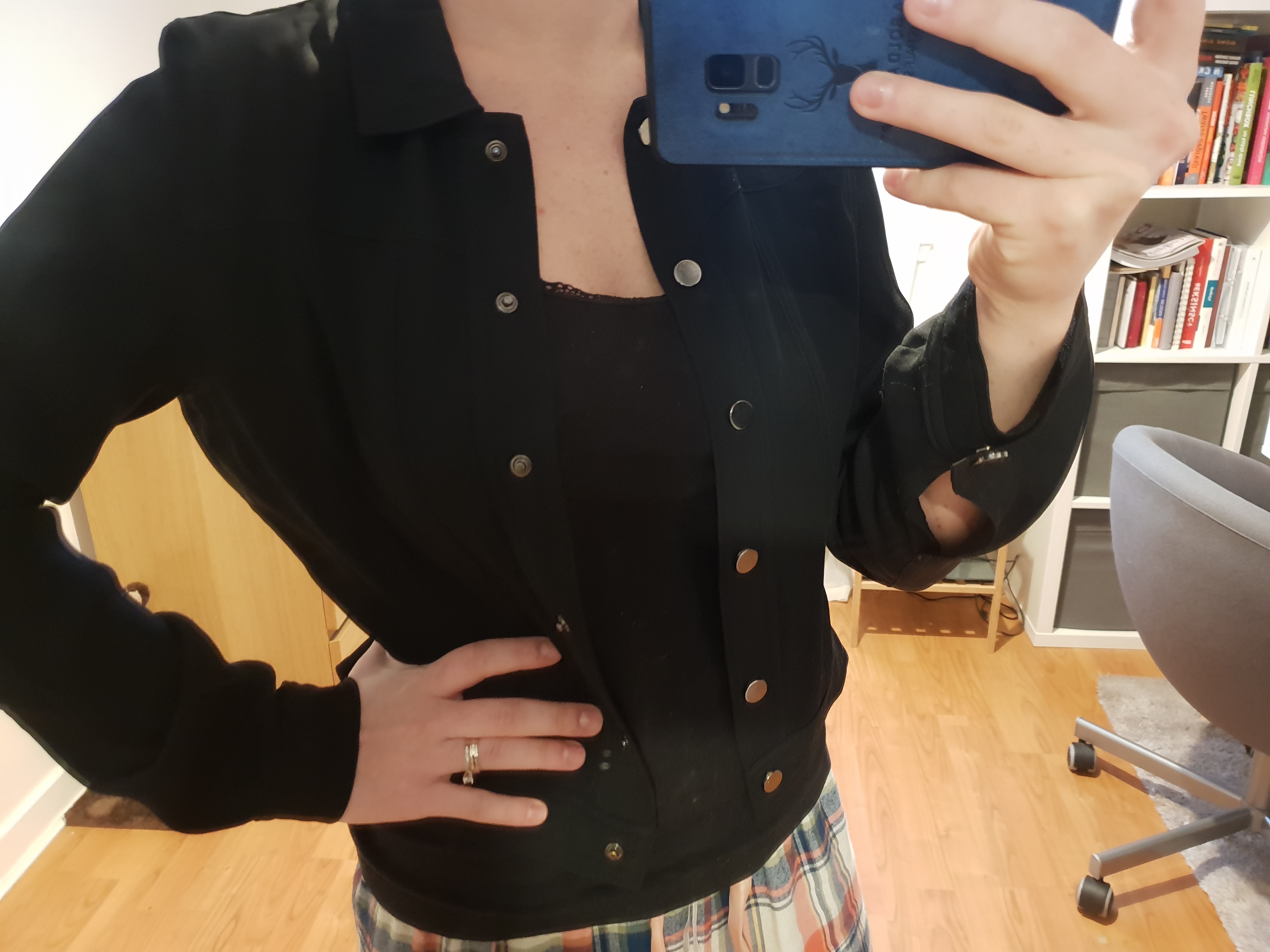 Jean looking casual fun polka-dot shirt. Made well- cotton.