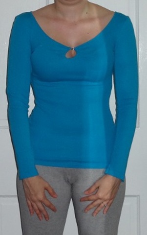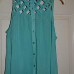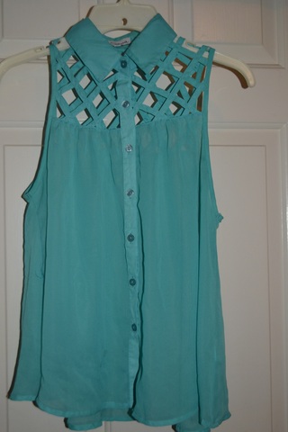 aqua colored sexy basic tee from Express, long length and sleeves, has a keyhole top with a little gem. putting "good" condition because there is a tiny little spot that got hit with bleach or something, literally the size of like two pinheads. otherwise great condition. will have better pics soon.