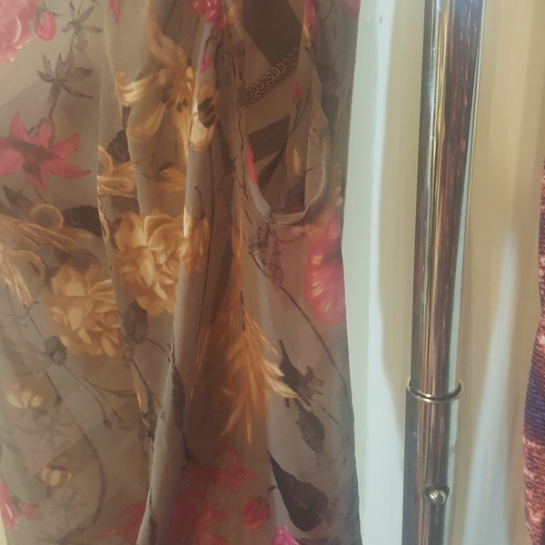 Cute Chinese Cheongsam inspired top with different shades of pink and rose print. Very soft silky material. Has been badly hemmed on the bottom but not very noticeable. Fits smaller than size, I suggest a medium wear this. Beautiful detail on collar that can be unfasten. Does have a zipper in the back. Perfect for summer.