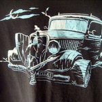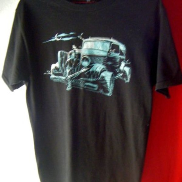 "trojan hearse" threadless shirt, size guys small. this is in good condition although slightly faded (though not faded more at the bottom like the picture might suggest, thats just something the sun did while I took the picture)