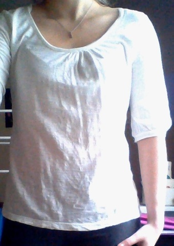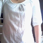 plain white quarter length sleeves. small. it is heathered. (I think this is the right term. it has lines of see through in it.)