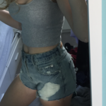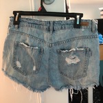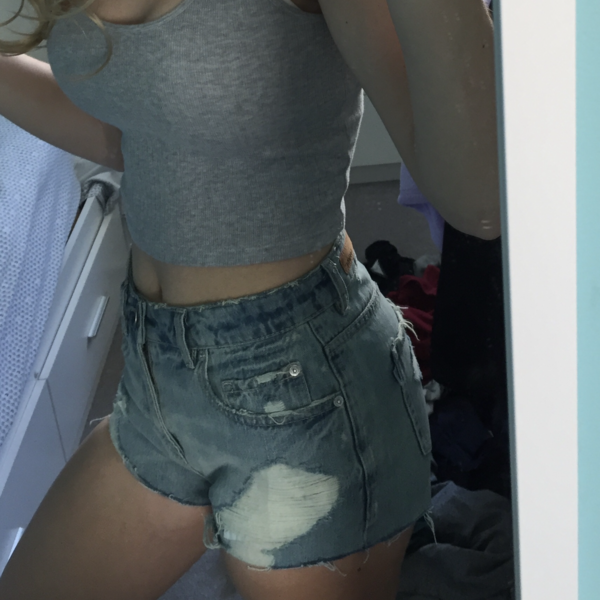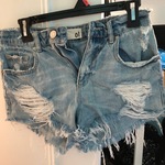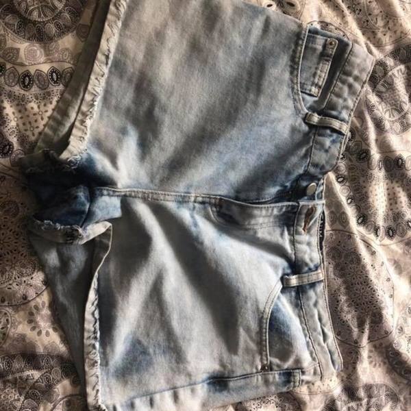 Basic distressed high waisted denim shorts! Frayed ends, light color variations, and a pocket the probably needs ironed... but overall super cute, and stretchy! I recomend being a true 0 to wear these, even though they are stretchy, the fit small.