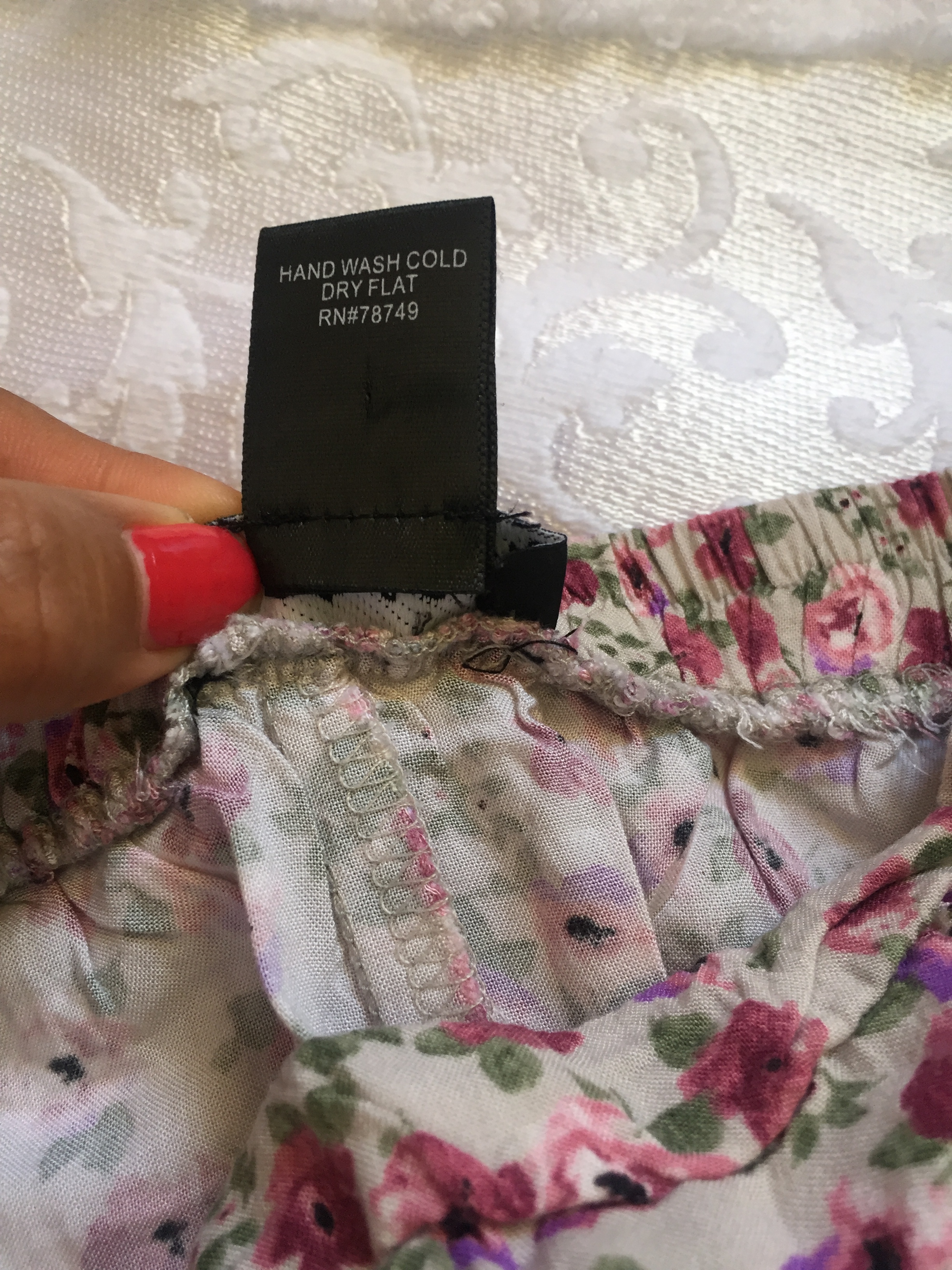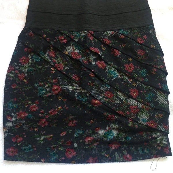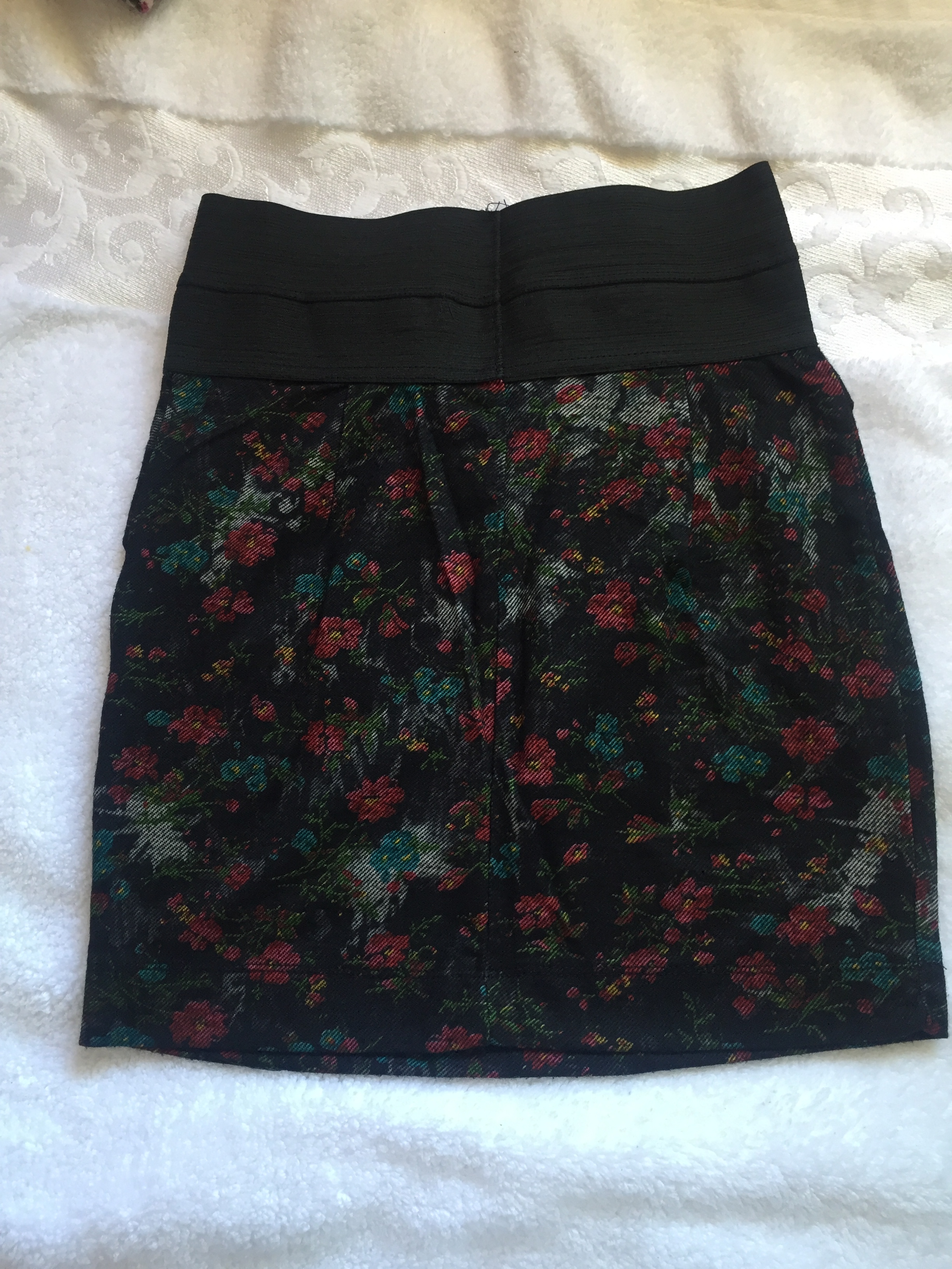 adorable pink/orange fitted stretchy pencil skirt, has a white floral pattern. Knee/midi length. I couldn’t get the color right in the color wheel thing, picture is pretty true to color. Measurements Waist: 12.5 in across Length: 24 in