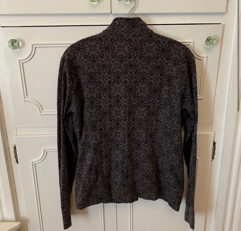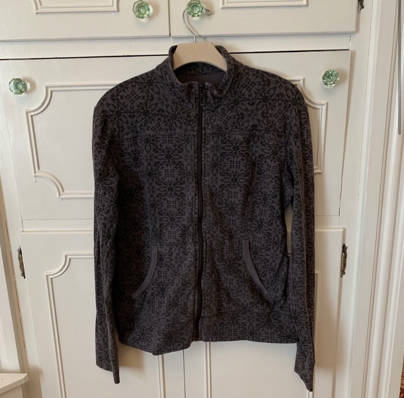 lightweight exercise sweat jacket with a discrete gray pattern. Has long sleeves, pockets, and zips up . It does have some wash wear, as seen in the pics. Measurements Pit to pit: 20.5 in Length: 24 in