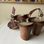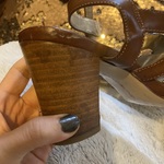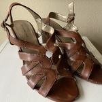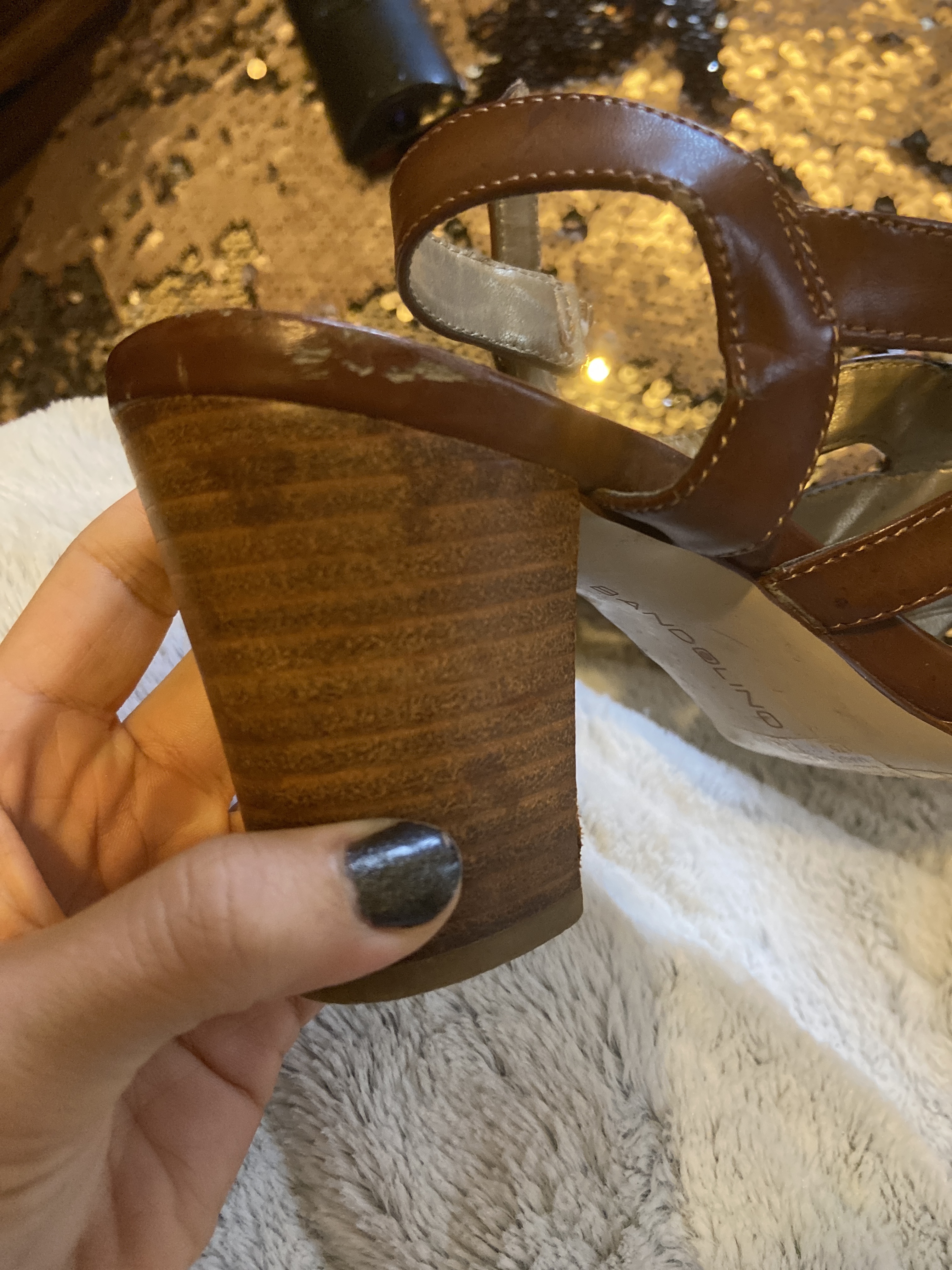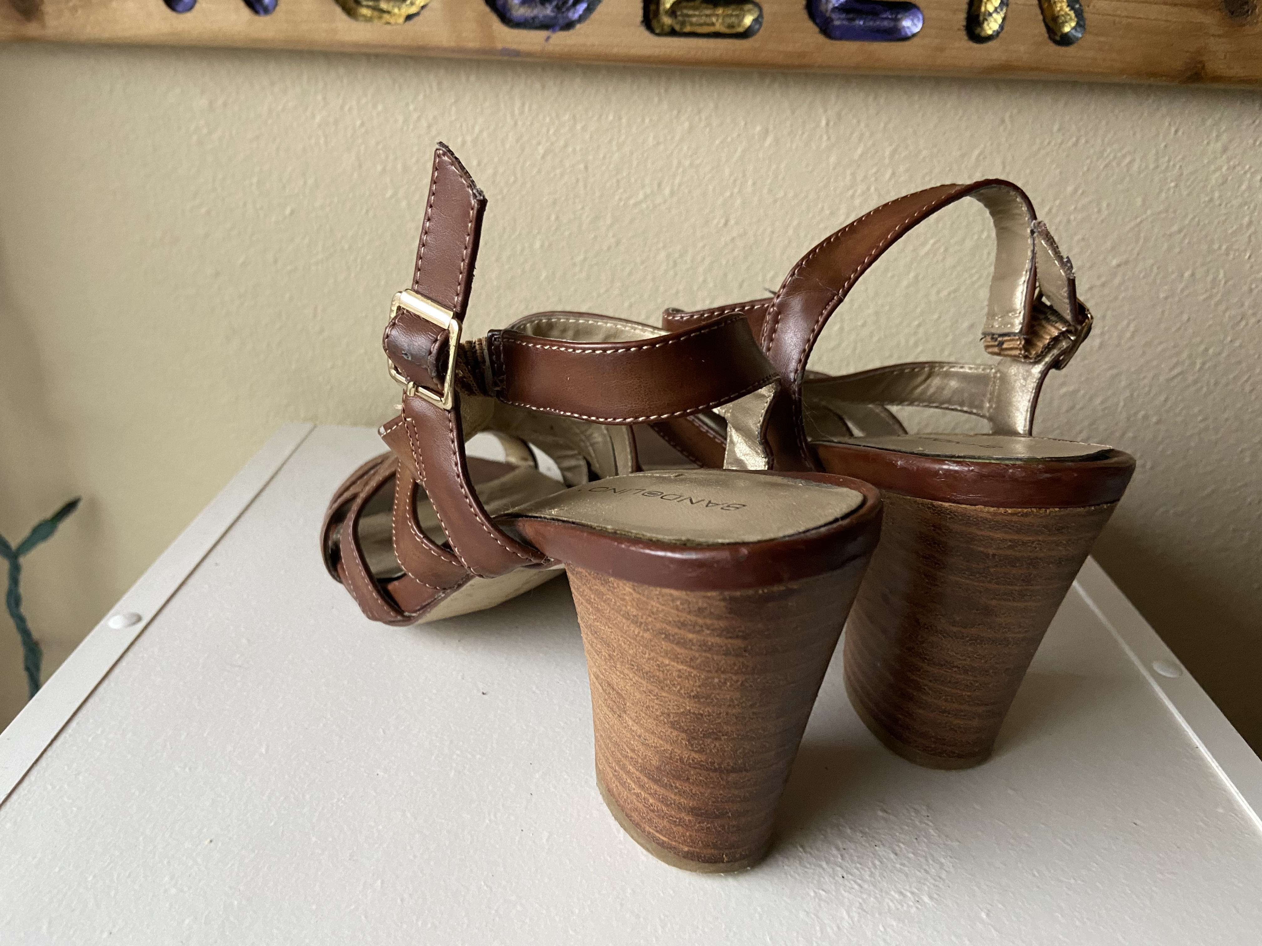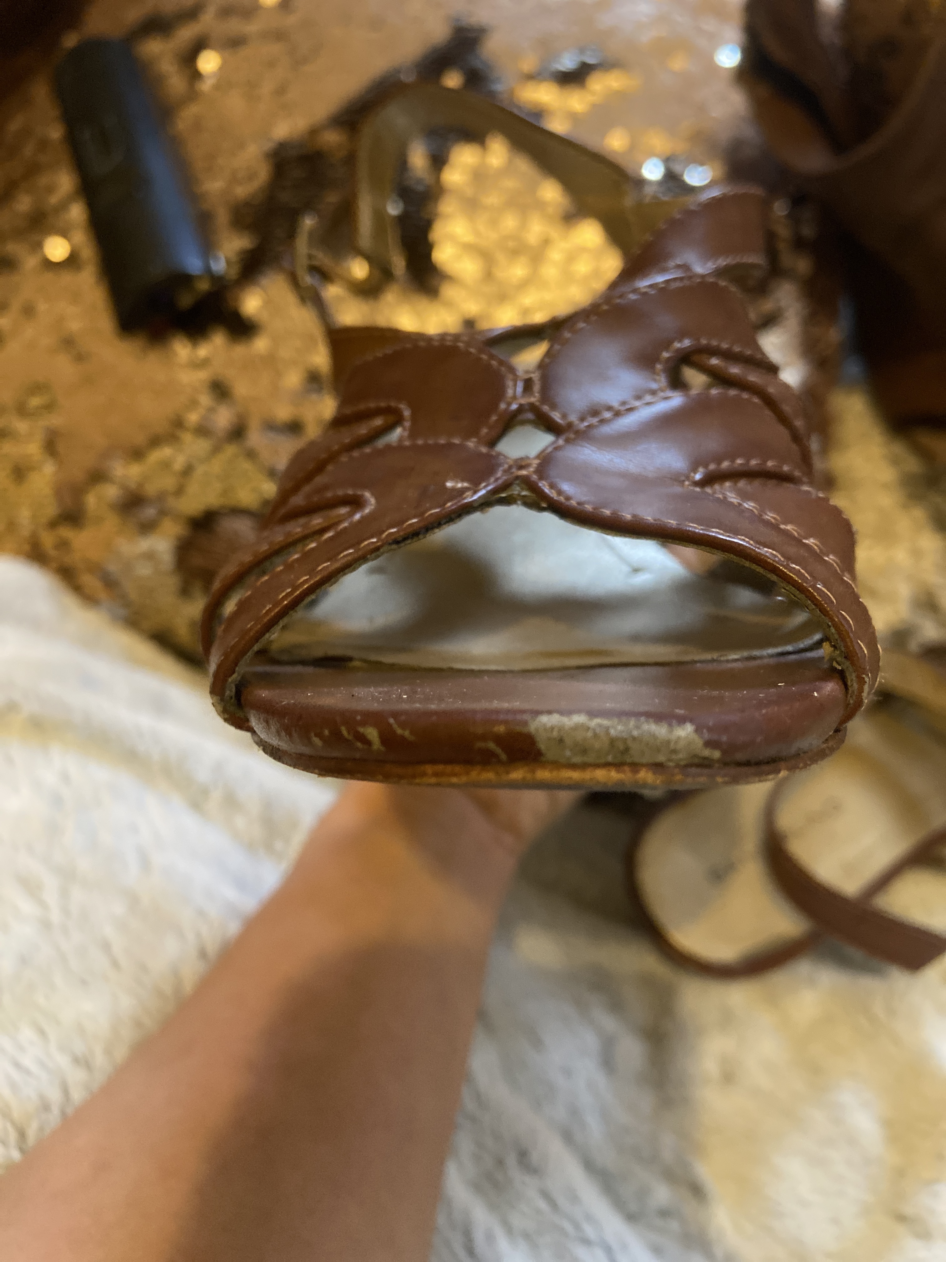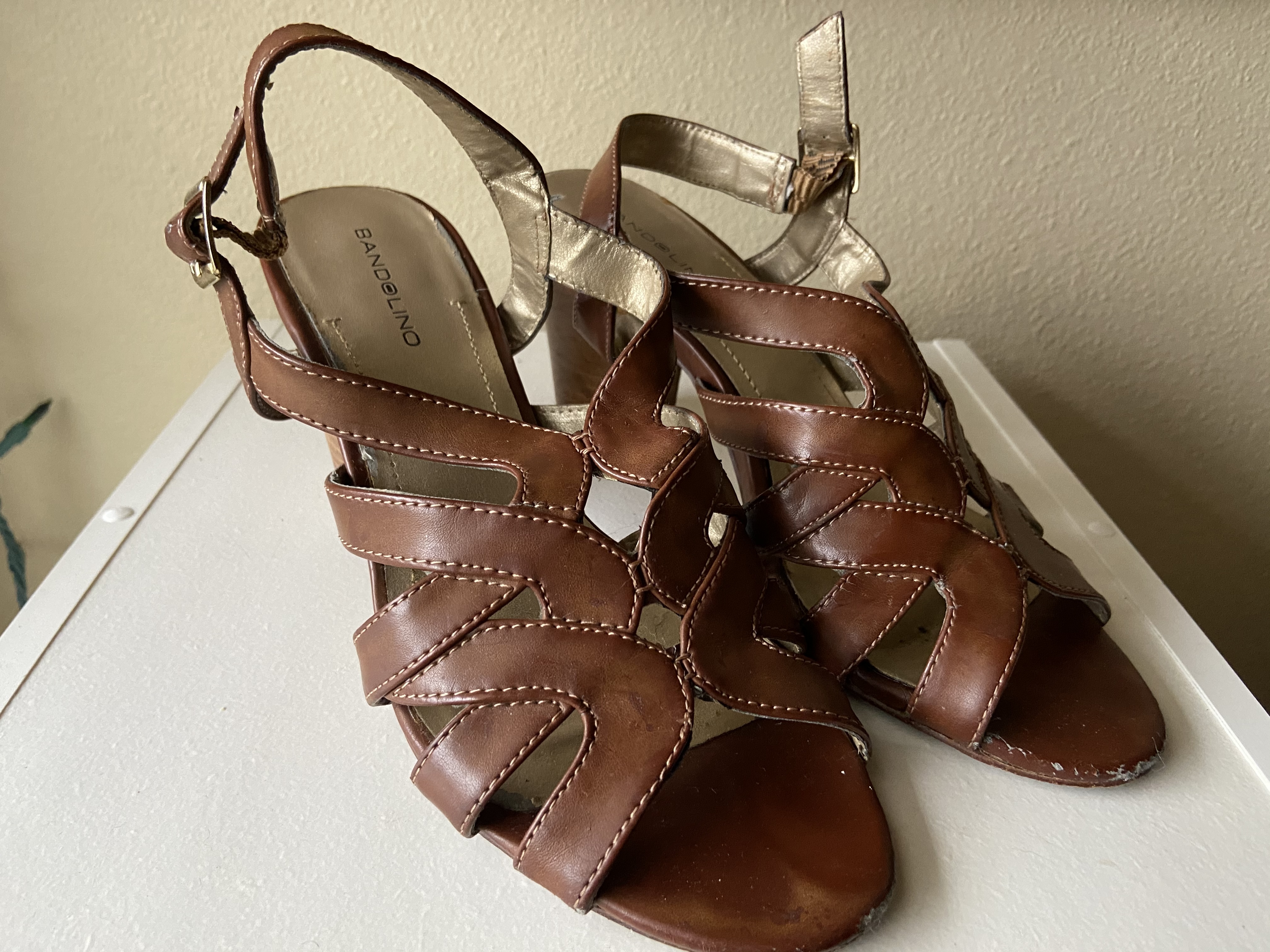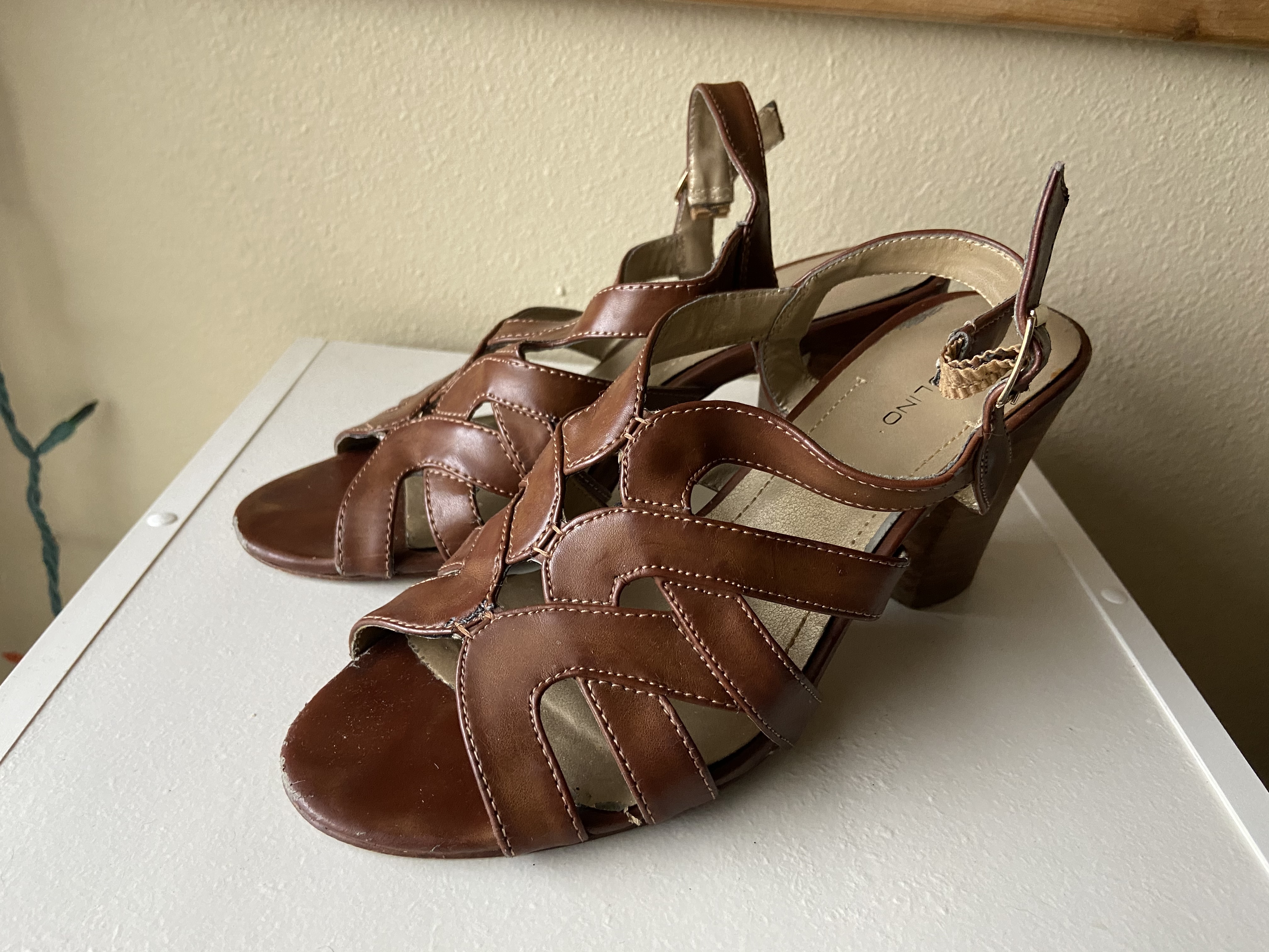 These have been worn many times. But they are still in relatively OK condition. Very comfy strappy heeled sandals.